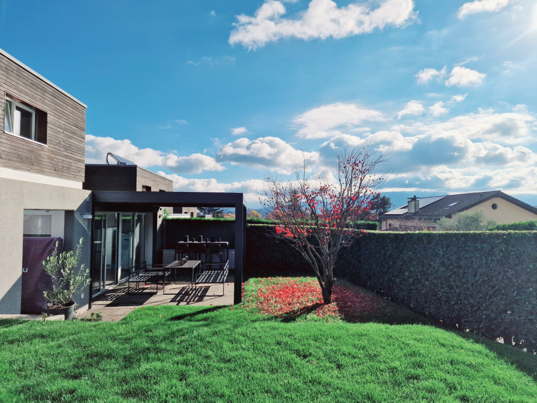 Découvrez votre future villa Minergie, contemporaine et familiale, idéalement située dans un quartier résidentiel et familial, à 5 minutes en voiture de Genève. Moderne et lumineuse, elle offre des espaces de vie agréables et confortables. Une jolie entrée mène au grand séjour lumineux, à la cuisine moderne et entièrement équipée, ainsi qu’à une belle véranda. Le jardin sur deux niveaux bénéficie d’une vue magnifique sur les montagnes et le Mont Blanc ainsi qu'un agréable Pergola avec toit ouvrant et lumières installé en 2025.
