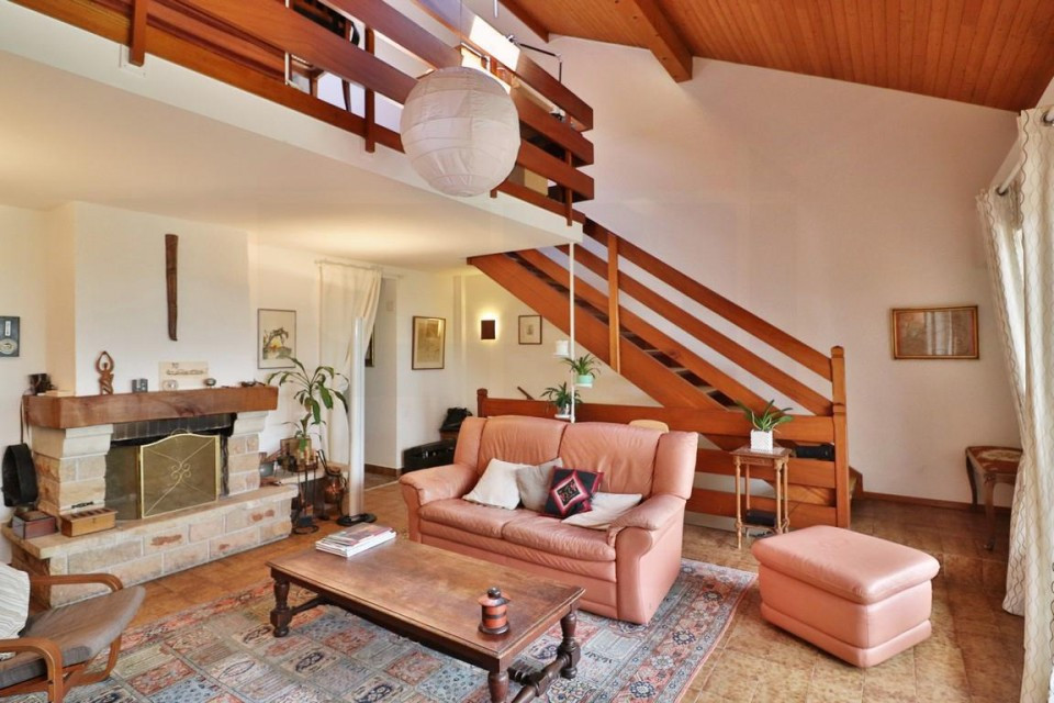 La partie jour se compose d'un lumineux séjour avec une très belle cheminée en pierre avec accès sur la terrasse de 24m2 ainsi qu'au jardin profitant d'une exposition opitmale. La cuisine est entièrement équipée et aménagée et a été refaite à neuf en 2013. Un wc visiteurs avec lavabo complète ce niveau.