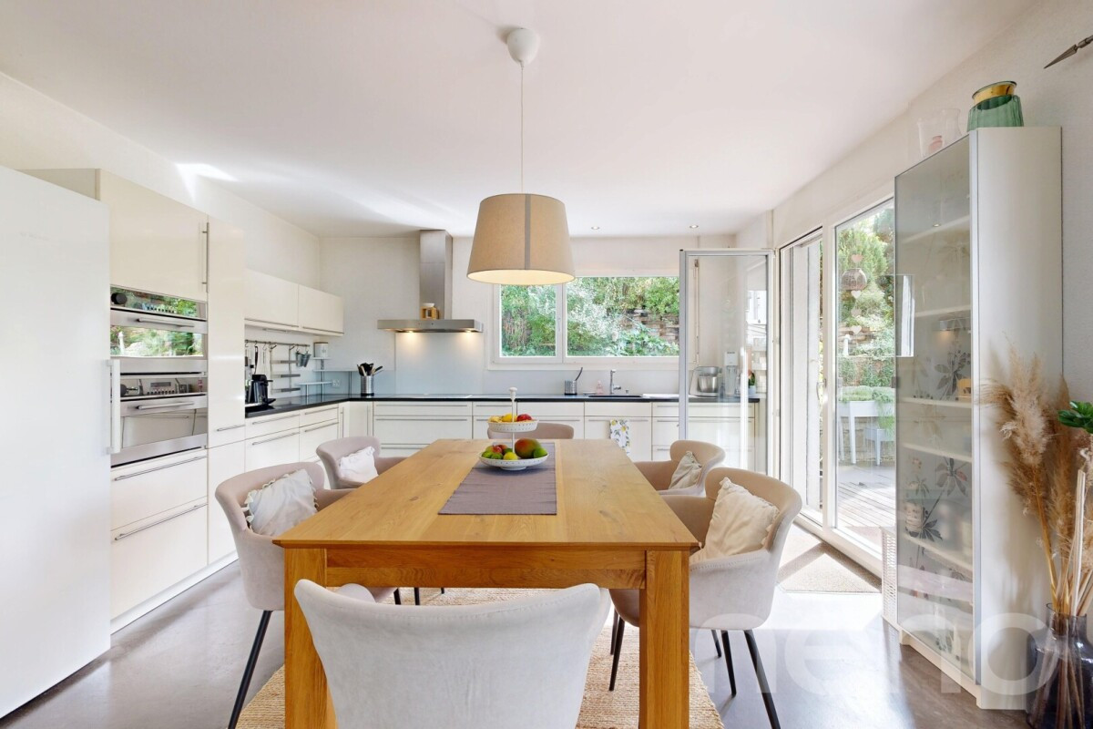 Der grosszügige, helle Wohnbereich besticht durch raumhohe Panoramafenster, ein einladendes Cheminée und eine offene Küche. Eine Veranda, ein Balkon und der gepflegte Garten mit Gartenunterstand laden zu entspannten Stunden im Freien ein.
