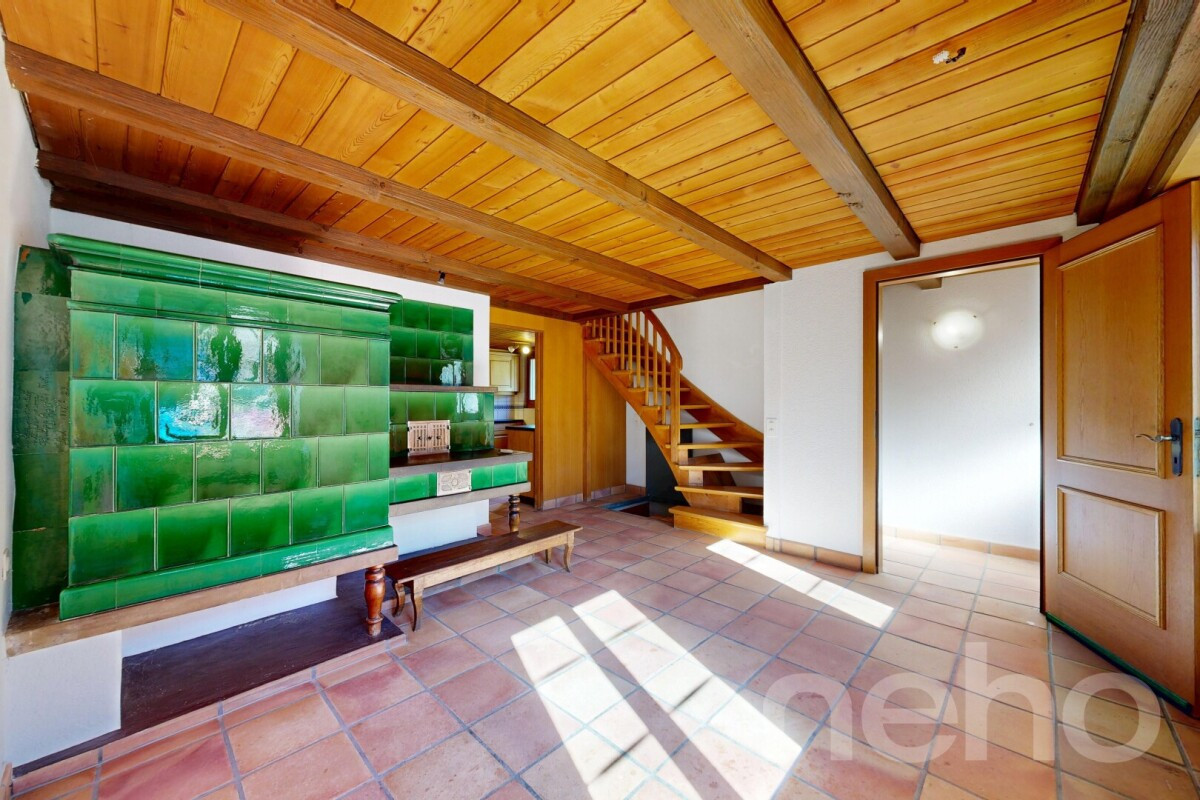 This charming 4-room house impresses with its rustic character, warm atmosphere and a standout feature: a large separate plot that can be used as a garden, play area or peaceful retreat. Two garage boxes located directly in front of the house are also included in the offer.In the basement, there is a cellar room directly beneath the dining area ? ideal for storage or supplies. The ground floor features terracotta flooring, exposed wooden beam ceilings and a traditional green tiled stove that adds character and cosiness. The adjoining country-style kitchen offers generous storage space, all essential appliances and a historic wood or soapstone oven, combining charm and practicality. A separate WC and a utility room complete this level.On the first fl...