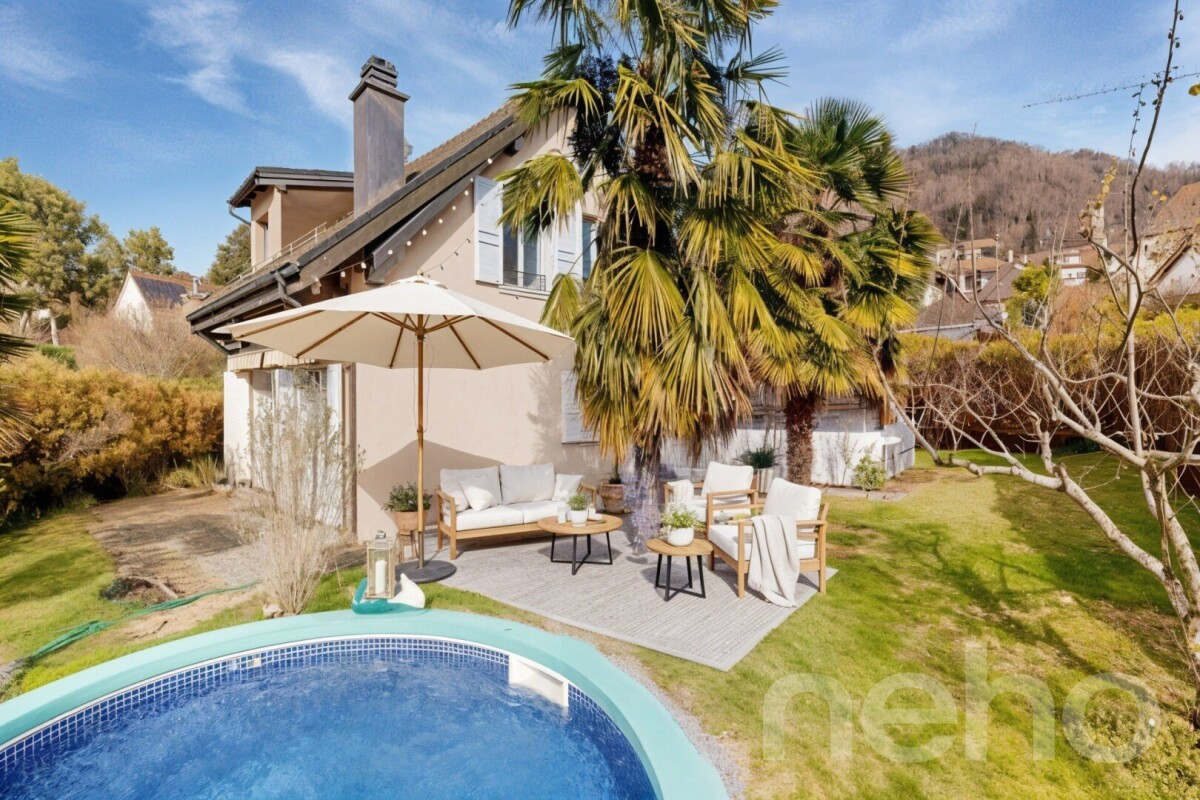 Nichée dans un environnement privilégié à deux pas du c?ur de Blonay, cette belle villa jumelée séduit par son emplacement recherché et son fort potentiel. Implantée sur une parcelle de 648 m², elle bénéficie d'une situation idéale, à proximité immédiate de toutes les commodités, tout en offrant une intimité préservée.Répartie sur deux niveaux complétés par un sous-sol excavé et partiellement chauffé, la maison propose des volumes agréables et une belle luminosité naturelle tout au long de la journée. Le sous-sol accueille notamment une spacieuse pièce de loisirs de plus de 20 m², idéale pour une salle de jeux, un espace fitness ou un home cinéma.Les espaces de vie s'ouvrent sur l'extérieur, où une piscine invite à profiter des beaux jours dans un cadre sans vis-à-vis, avec une vue dégagée sur les Alpes.Un couvert à voitures pouvant accueillir deux véhicules vient compléter ce bien. Des travaux de rénovation sont à prévoir, laissant entrevoir une belle opportunité de personnalisation pour créer un lieu de vie à votre image.Une propriété rare par sa situation et son potentiel, idéale pour les amateurs de projets.