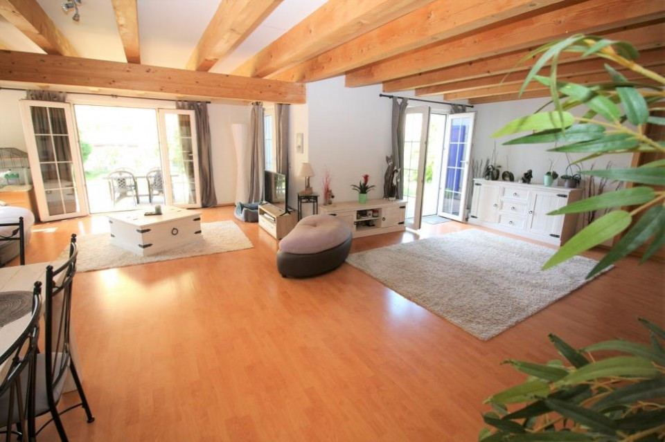 Immense salon avec poêle suédois, cuisine ouverte et terrasse ouverte sur un jardin de plus de 1'000m2.