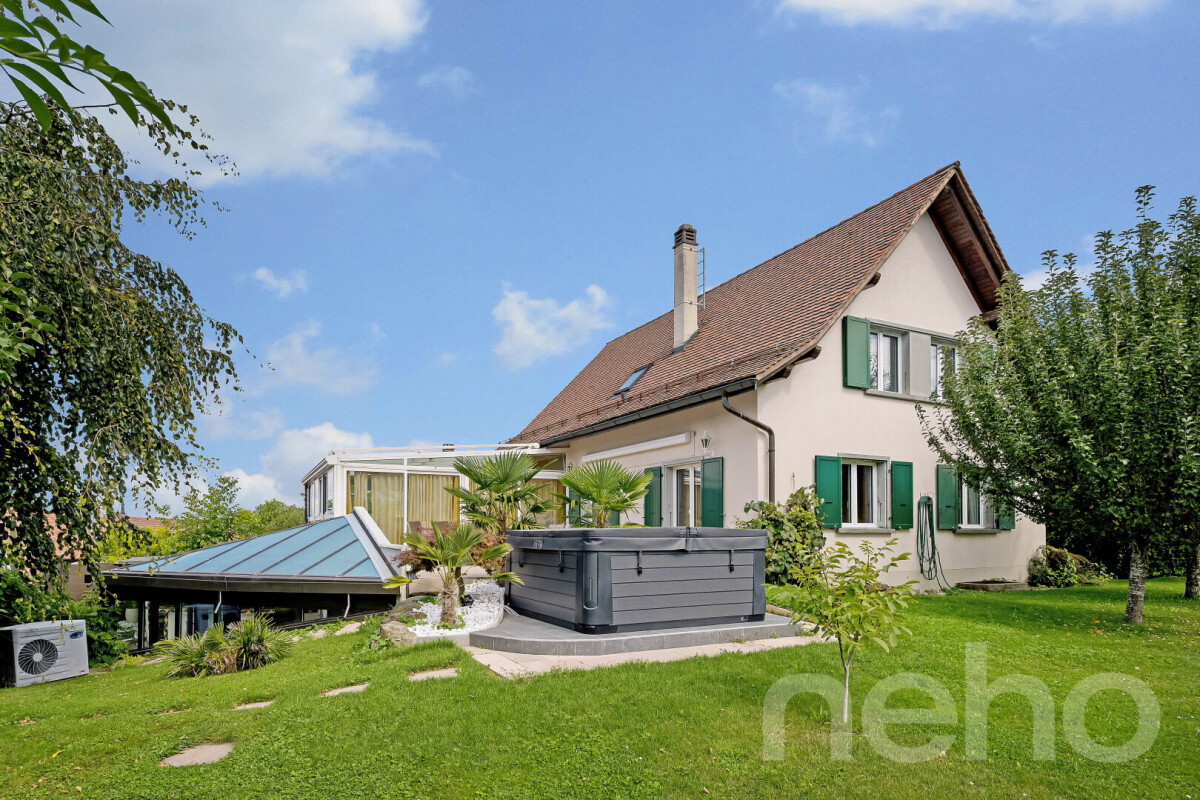 A 5 mn d’Echallens, 15 mn de Lausanne, dans le joli village de Bottens, magnifique villa vaudoise de 9.5 pces, dont 7 chambres, pour une surface habitable de 280 m2, une surface utile de 500 m2 et un volume de 1570 m3. Construite en 1972, elle a été en très grande partie rénovée entre 2023 et 2024 et offre de superbes volumes, une belle luminosité , une très grade véranda avec chauffage...