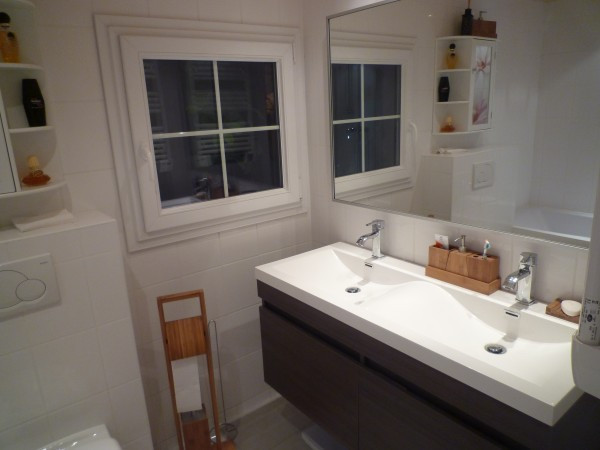 En dessous, 3 chambres à coucher, une salle de bain avec douche italienne et baignoire, une cave