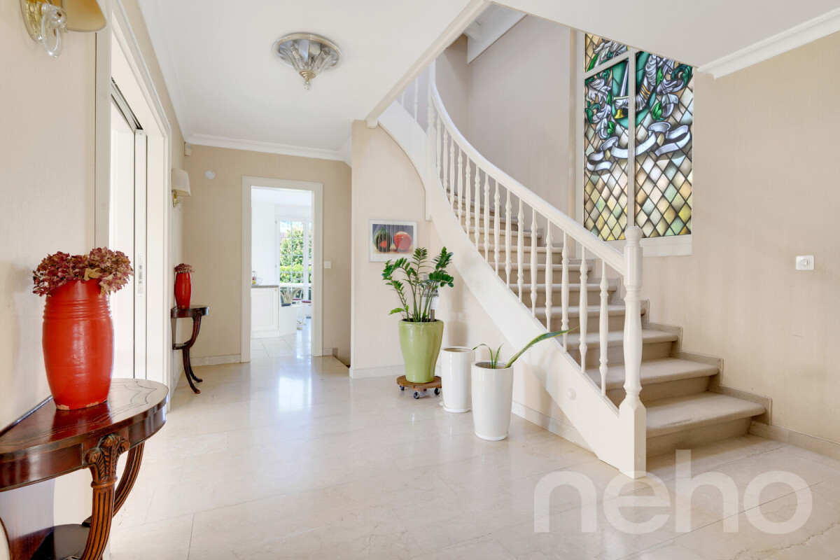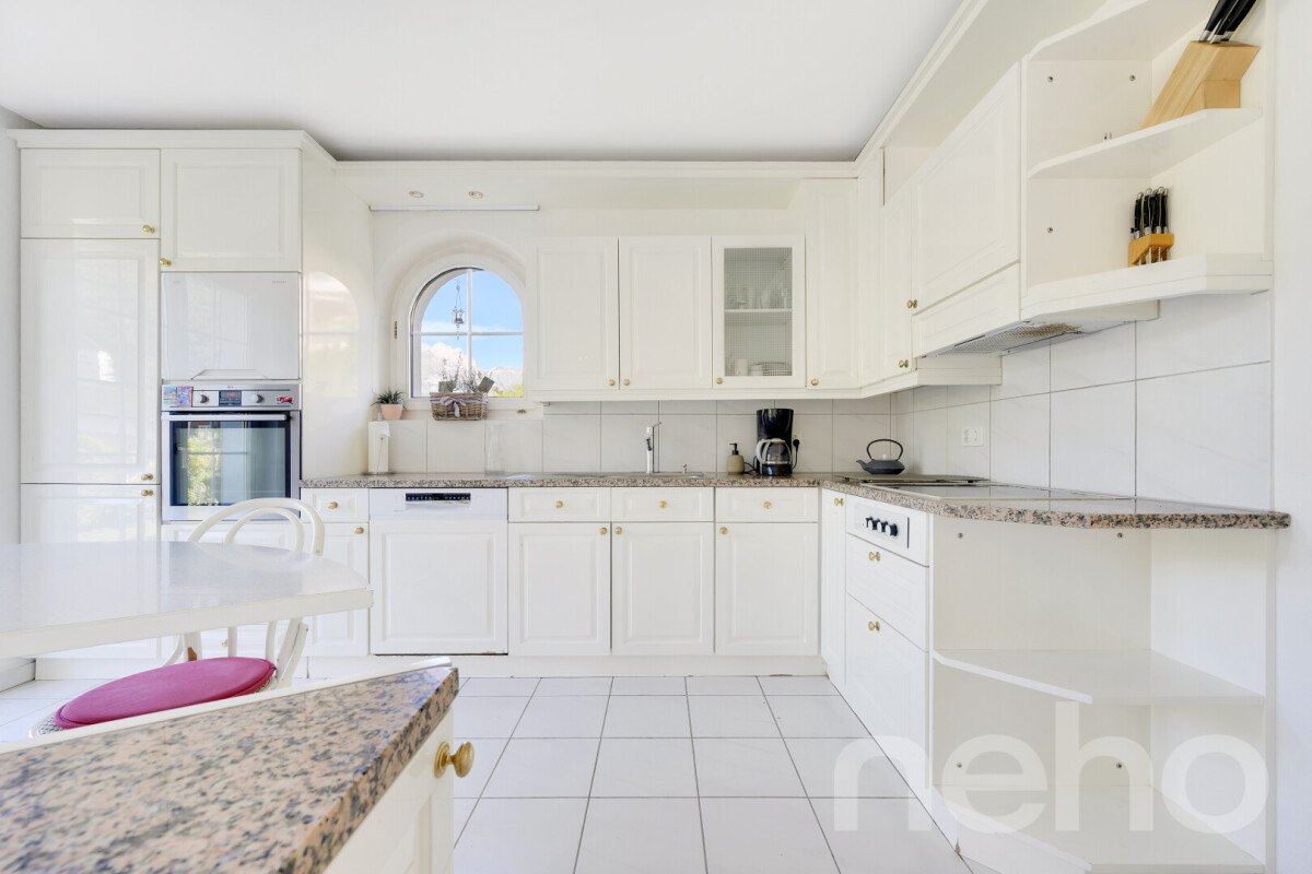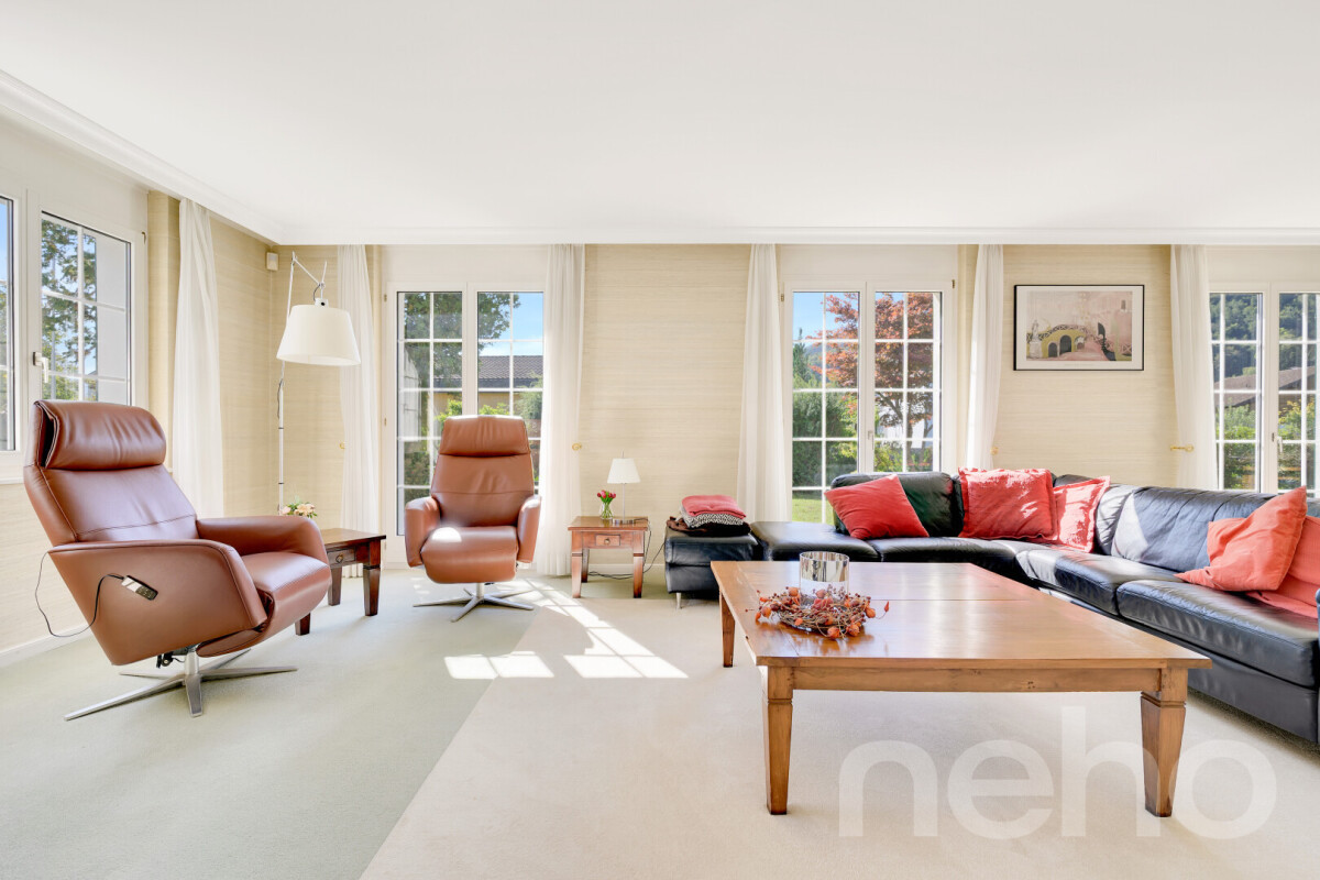 Die rund 270 Quadratmeter Wohnfläche verteilen sich auf drei Etagen. Das Erdgeschoss überzeugt mit einem weitläufigen Wohnzimmer samt Cheminée, einem separaten Essbereich und einer hellen Küche. Von hier gelangen Sie direkt in den gepflegten Garten mit mehreren Sitzplätzen. Im Obergeschoss befinden sich vier Schlafzimmer und zwei Badezimmer, im Untergeschoss ergänzen ein Hobbyraum, Büroflächen sowie Abstellräume das Angebot.