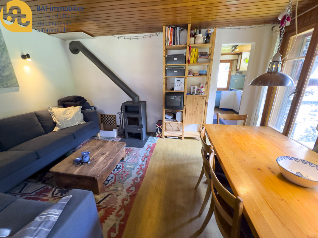 • Salon avec coin à manger, poêle à bois, et accès à la terrasse sud et au jardin