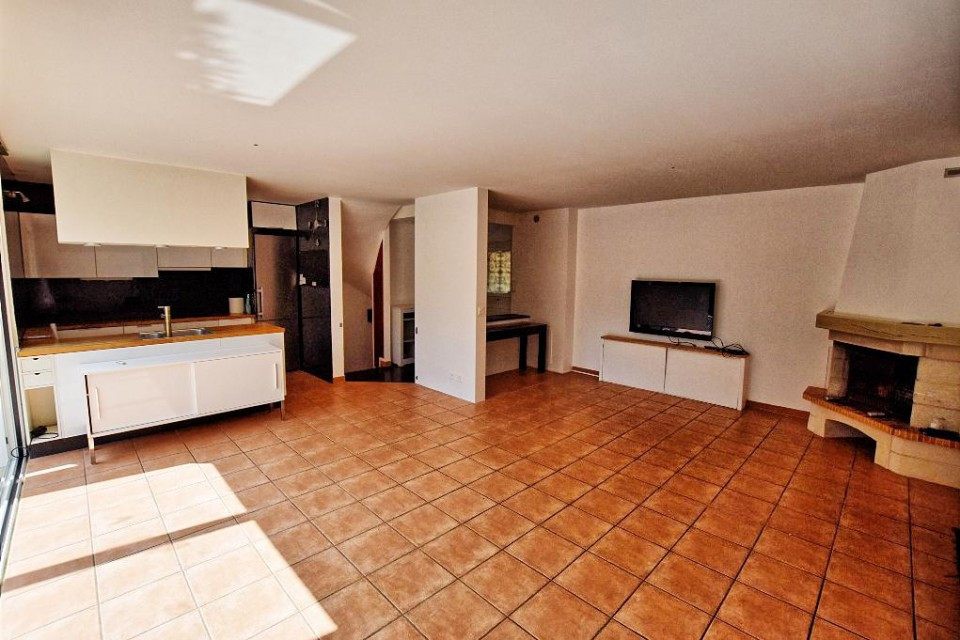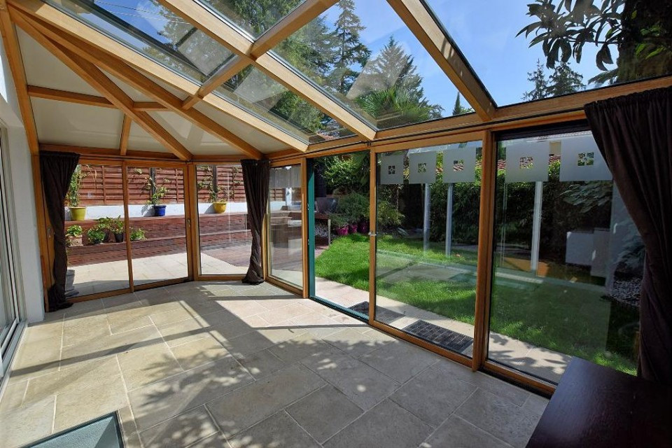 Un salon-séjour avec cheminée ouvert sur une belle véranda chauffée, et un jardin arboré de 250 m².