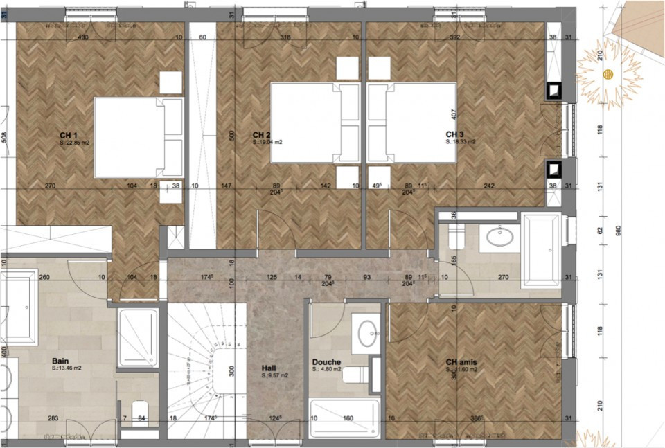A l'étage, un hall desservant d'abord une chambre d'amis et une salle de douche, puis deux chambres à coucher de 18 et 19 m2, cette dernière disposant d'un balcon, puis une salle de bain. De l'autre côté, une suite comprenant une grande chambre de 22 m2 et une salle de bains de 13 m2 avec baignoire et double vasques, ainsi qu'un wc et une douche.