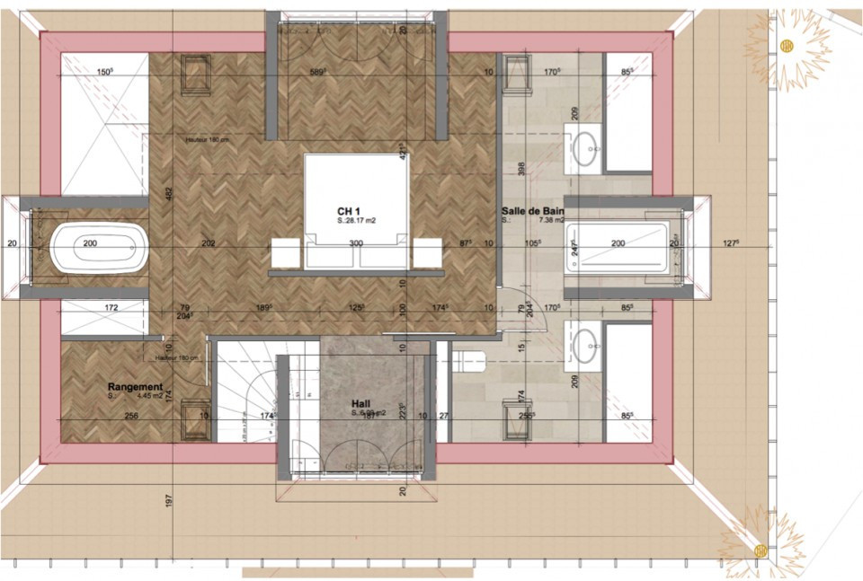 Dans les combles, un hall et une superbe suite parentale comprenant une chambre de 28 m2, un espace rangement/dressing et une large salle de bain avec baignoire, deux lavabos et un wc. Cet étage aura une surface totale de 47 m2.