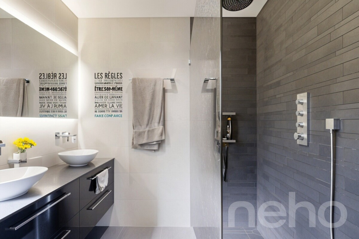 Le niveau principal accueille les espaces de vie. Le salon de plus de 32 m² et la salle à manger d'environ 20 m² forment un ensemble convivial, prolongé par plusieurs terrasses totalisant plus de 90 m², offrant une belle continuité entre intérieur et extérieur. La cuisine, fonctionnelle et bien proportionnée, bénéficie également d'un accès direct aux extérieurs. Ce niveau comprend encore une entrée avec dressing, une salle de bains ainsi qu'une chambre.