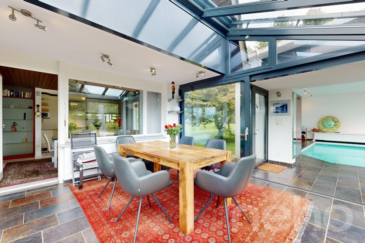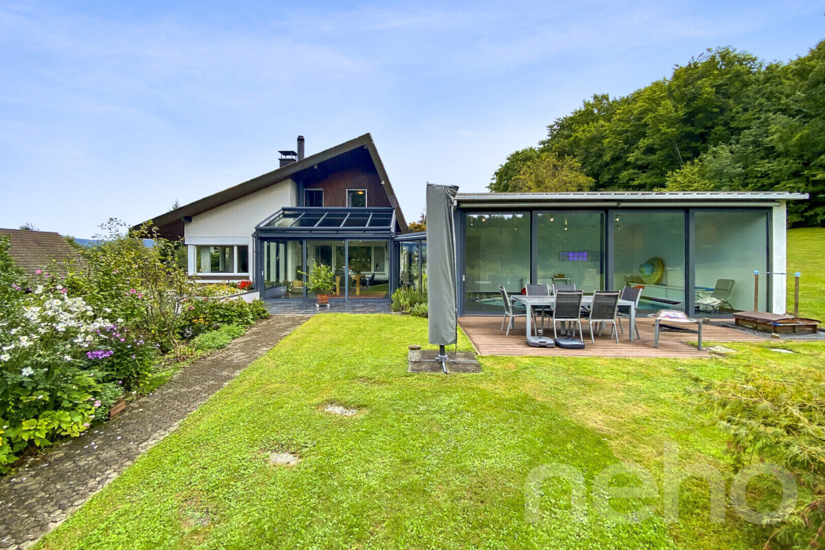 Dieses aussergewöhnliche 6.5-Zimmer-Haus in Däniken bietet auf 211?m² Nettowohnfläche ein durchdachtes Raumkonzept mit lichtdurchfluteter Galerie, stilvollem Cheminée im Wohnbereich sowie modernisierter Ausstattung. Auf grosszügigen 2'534?m² Grundstücksfläche verschmelzen Wohnqualität und Naturerlebnis. Ein beheizter Wintergarten (19?m²) mit Schwedenofen bildet das Herzstück - von hier aus direkter Zugang zum hauseigenen Hallenbad (48?m²), ausgestattet mit Gegenstromanlage, sep. Dusche, Boden- und Wandheizung sowie voll öffenbarer Fensterfront für ein einzigartiges Innen-Aussen-Erlebnis. Der gepflegte Garten mit Biotop und angrenzendem Wald schafft eine ruhige, naturnahe Atmosphäre mit herrlicher Weitsicht. Die Liegenschaft verfügt über eine PV-Anlage, moderne Entkalkungsanlage sowie eine Garage mit elektrischem Tor und direktem Hauszugang. Ein exklusives Zuhause für Anspruchsvolle - ruhig, effizient, naturverbunden.