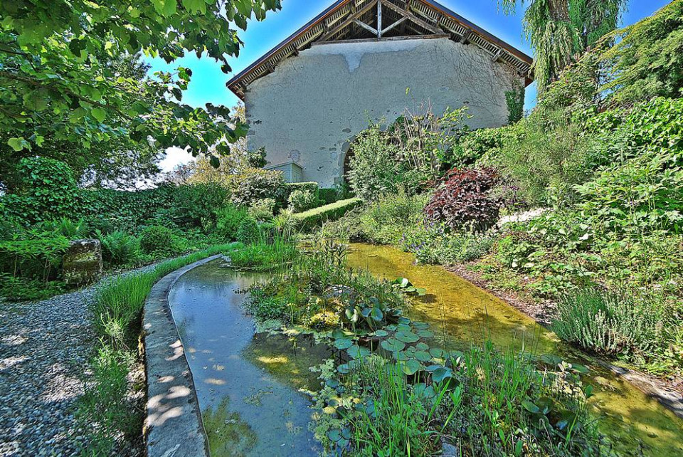 Grandes baies vitrées ouvrant sur un magnifique jardin paysagé agrémenté d'une mare.