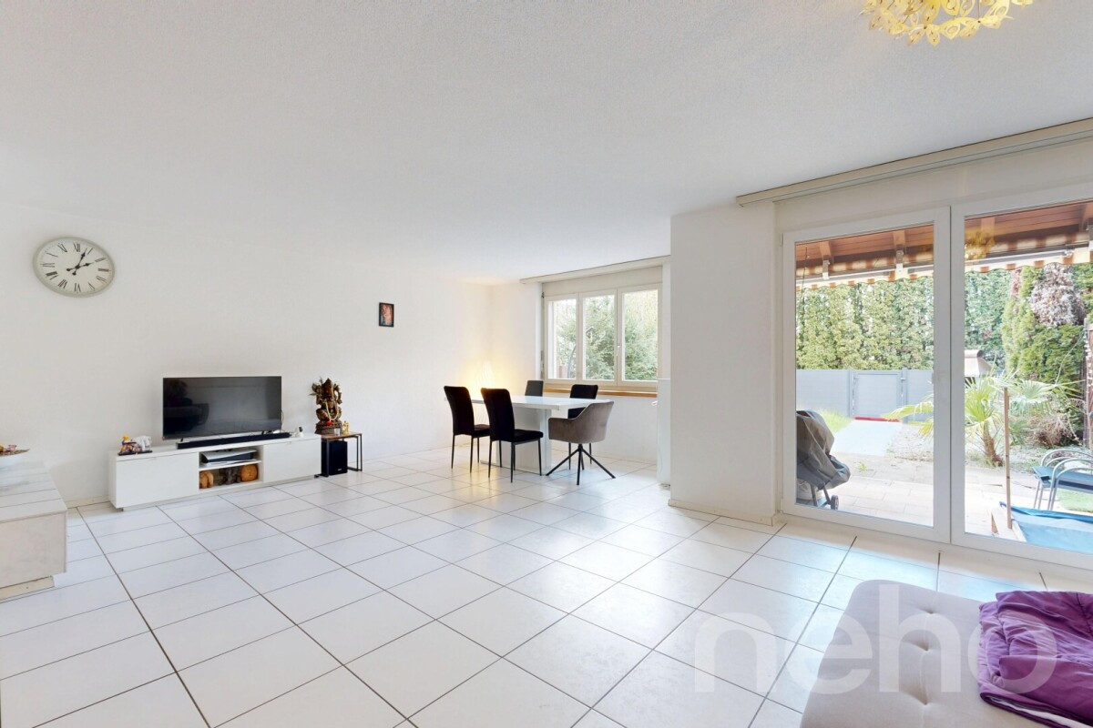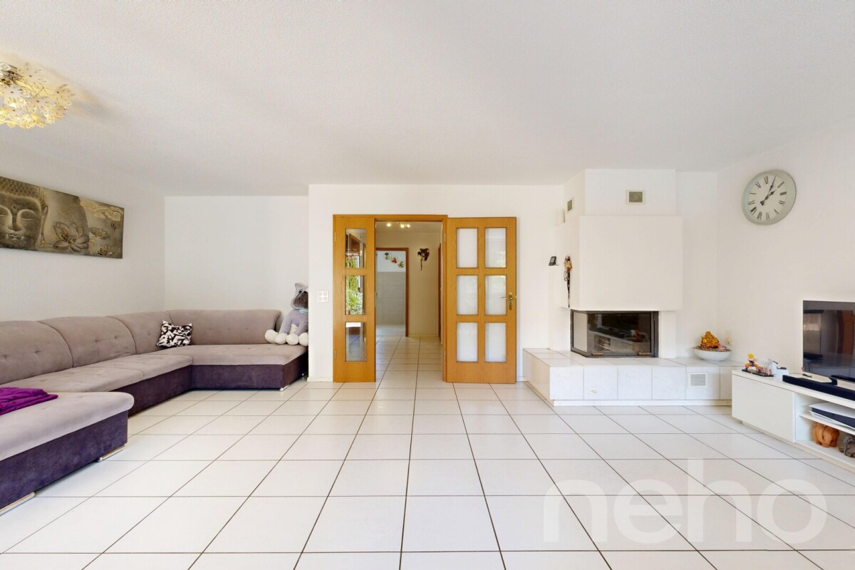 Im Erdgeschoss erwartet Sie ein grosszügiges Wohnzimmer mit Cheminée, das eine angenehme Wohnatmosphäre schafft. Von hier aus gelangen Sie direkt in den Aussenbereich mit Grünfläche, ideal zum Entspannen oder für Kinder zum Spielen. Ebenfalls auf dieser Etage befinden sich eine separate Küche, ein zusätzliches Zimmer sowie ein Gäste WC.