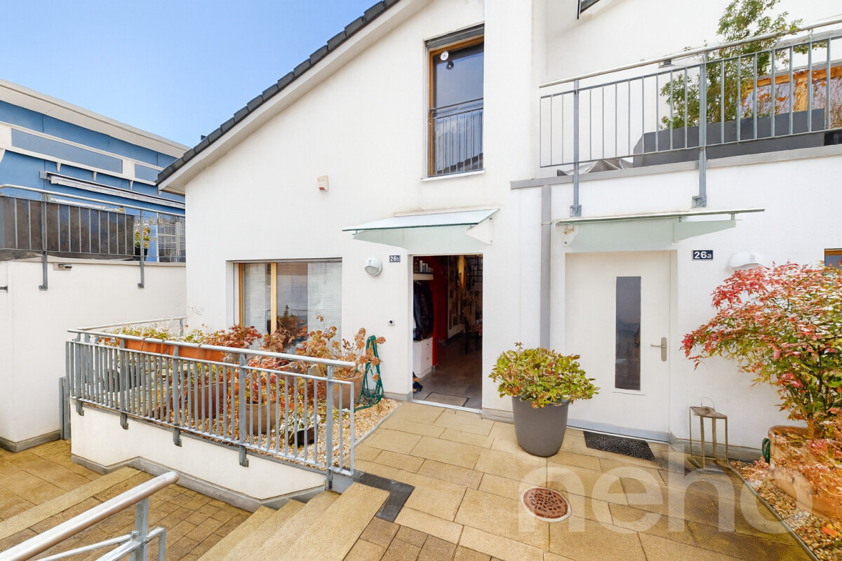 This spacious 4.5-room house impresses with its distinctive architectural character, well-thought-out layout and generous living space spread across multiple levels. With a total area of approximately 191 m², the property offers a high level of comfort and flexibility, ideal for couples, families or anyone who appreciates space and light.The ground floor welcomes you with an inviting entrance area leading into the dining space with an adjoining kitchen. The kitchen is functional and seamlessly integrated into the living concept. From here, direct access leads to the terrace, providing an ideal setting for outdoor relaxation. Two rooms on this level can be used flexibly as bedrooms, children's rooms, guest rooms or a home office. A bathroom and generous circulation areas complete this floor, creating an open and airy atmosphere.The upper floor features a spacious living area with impressive ceiling height and visible roof construction, giving the room a warm and distinctive ambiance. Large windows allow plenty of natural light and provide access to the balcony. An additional room and a second bathroom complete the space on this level.The basement offers practical utility areas, including a laundry room and storage space, providing valuable functionality for everyday living.The offer includes one underground parking space, ensuring convenient and secure parking. Additional visitor parking spaces are also available within the underground garage. Several outdoor areas, including balconies and terraces, extend the living space outdoors and offer various places to relax throughout the day. The successful combination of space, functionality and architectural charm makes this property a truly special home with a high quality of living.