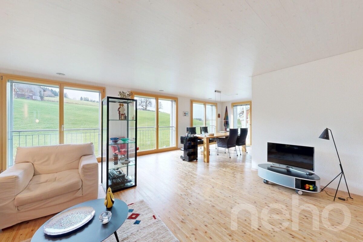 • Grosszügiger Wohn- und Essbereich mit direktem Zugang zum überdachten Balkon