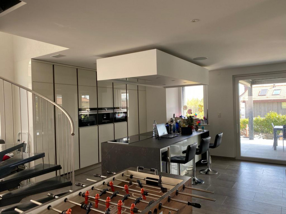 Ce bel appartement de 194m2 se situe au RDC et au 1er étage. Il est de style contemporain, plein de charme. Il se compose de 5,5 pièces plus une chambre individuelle en sous-sol avec lumière directe de 37m2 (surface totale de 231m2).