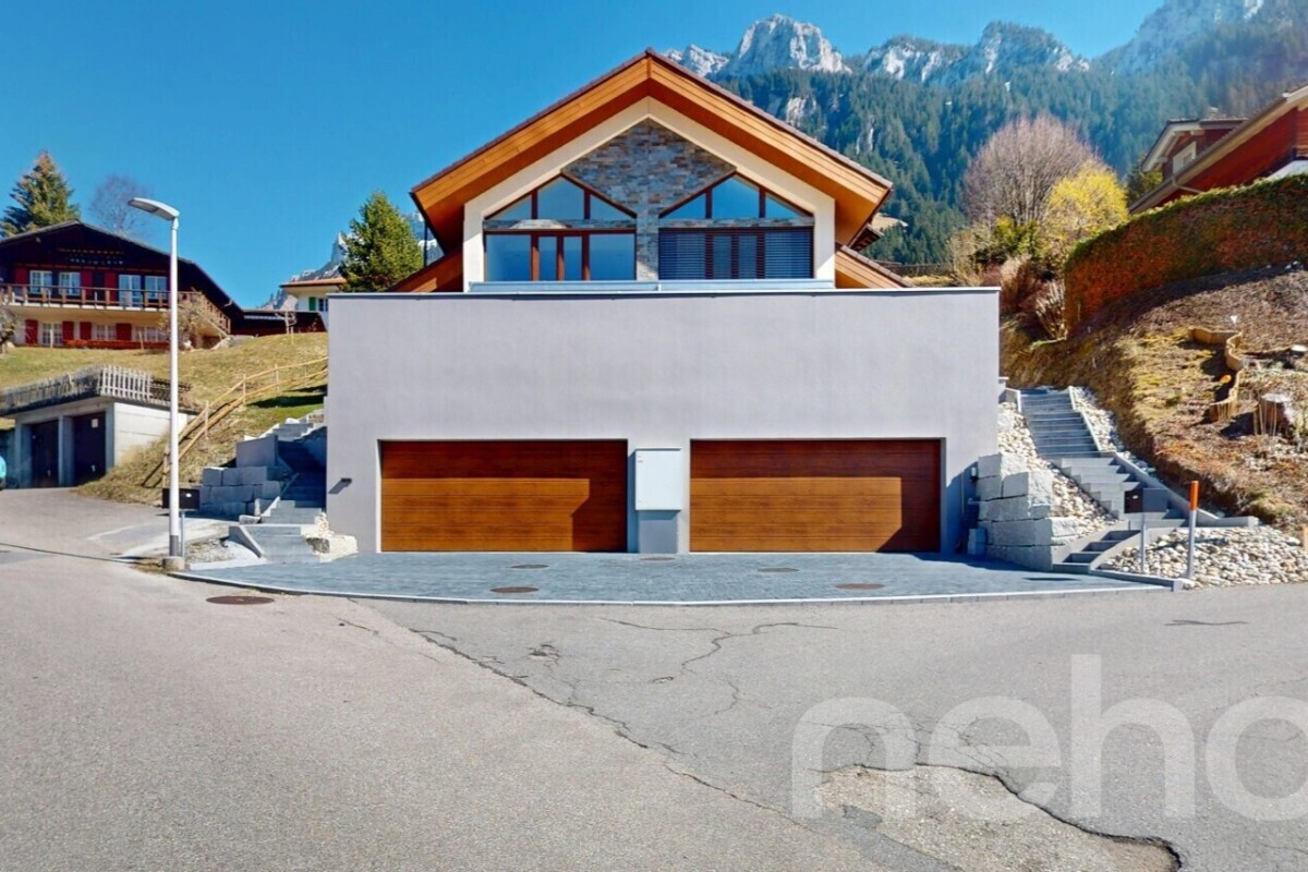 Die grosse Doppelgarage mit E-Mobilanschluss ist direkt mit dem Haus erschlossen. Ein Rekuperationssystem im ganzen Haus und eine hervorragende Wärmedämmung zeichnen diese neue Liegenschaft aus.