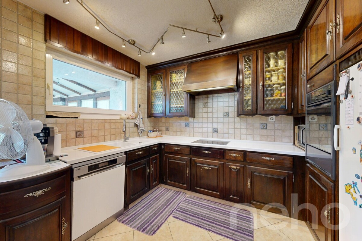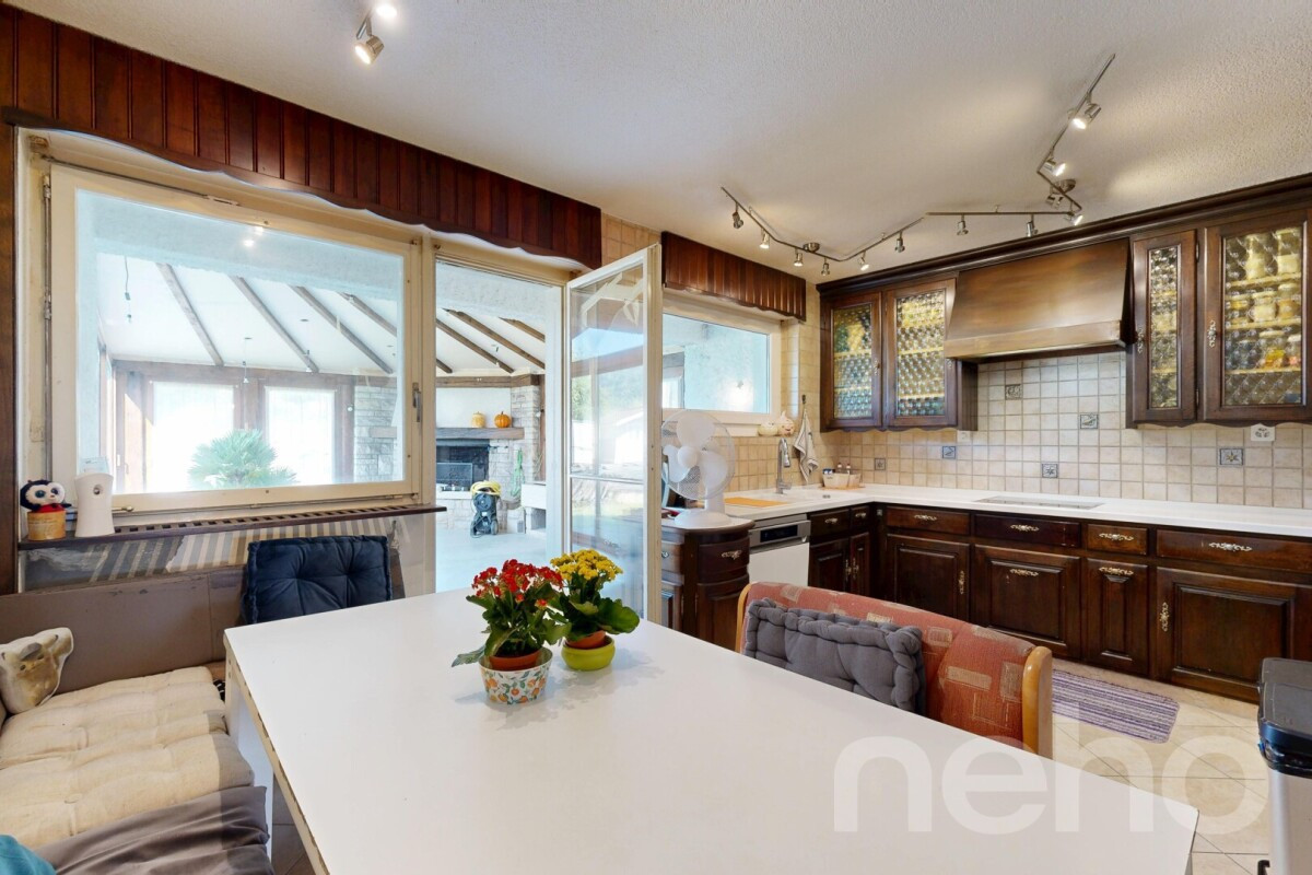 Cuisine en bois massif entièrement équipée (Zug, Sam, vitrocéramique) avec accès direct à une véranda couverte de 30 m² rénovée en 2015 avec très grande cheminée/grill en pierre du jura.