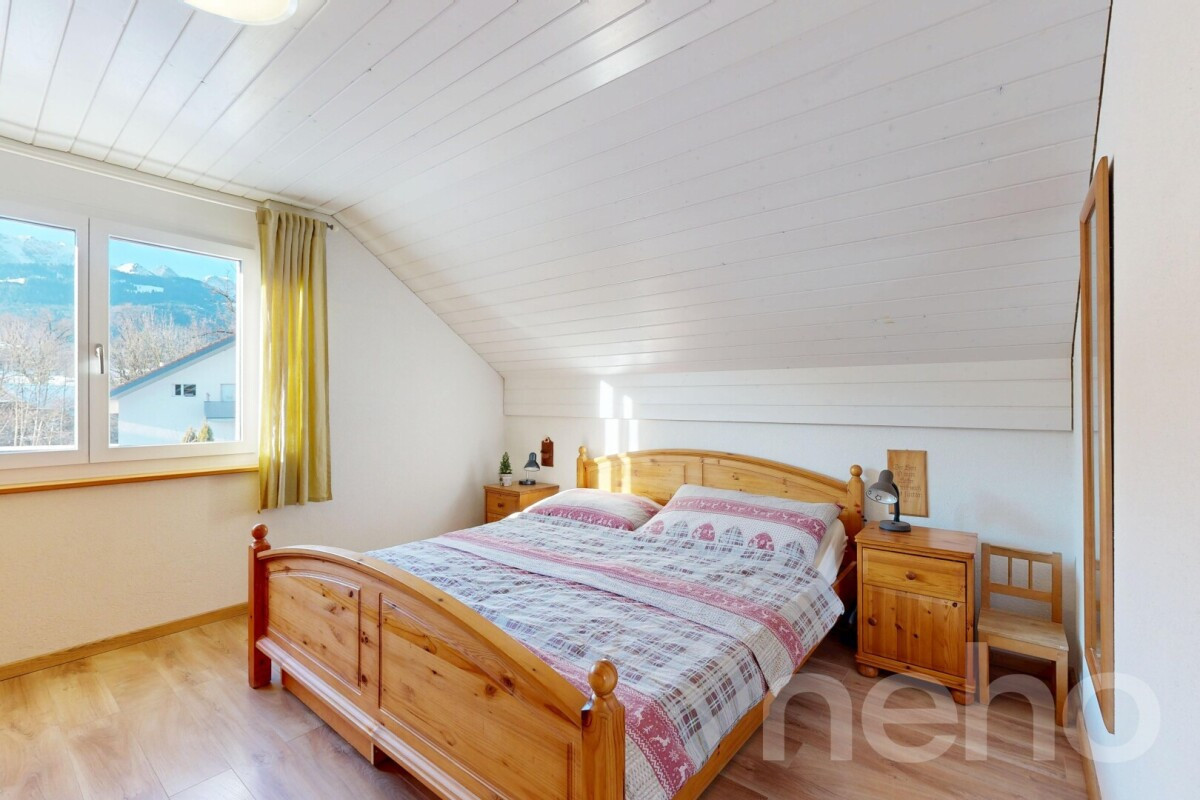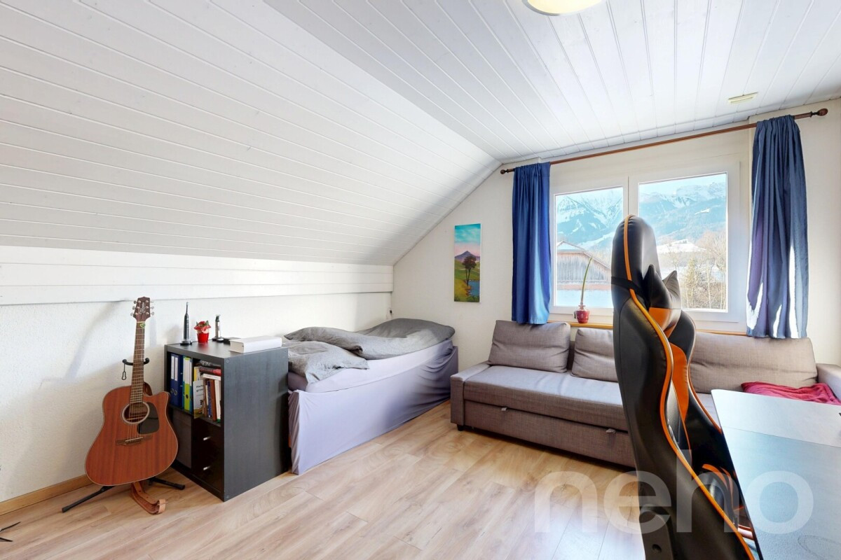 Das Obergeschoss verfügt über vier gut geschnittene Schlafzimmer sowie ein grosszügiges Badezimmer mit Badewanne. Die Räume sind hell, ruhig und familiengerecht angeordnet, die Dachschrägen sind optimal genutzt.