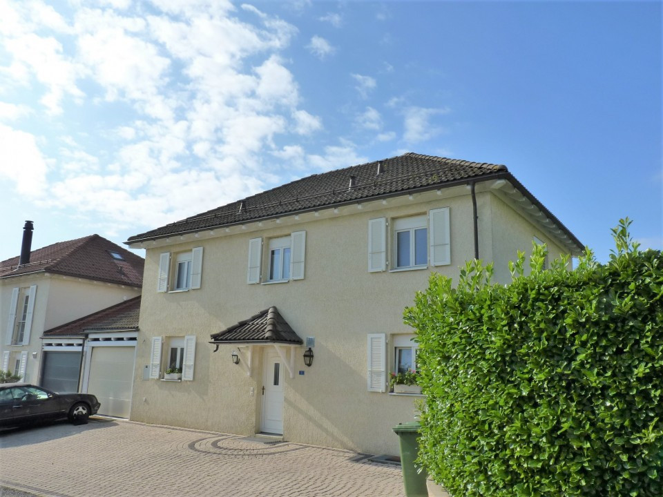 Au calme et bien ensoleillée, vous trouverez cette jolie villa jumelle par le garage (5.5 pièces) avec une surface habitable de env. 240 m2 puis construite sur une parcelle de 750 m2.