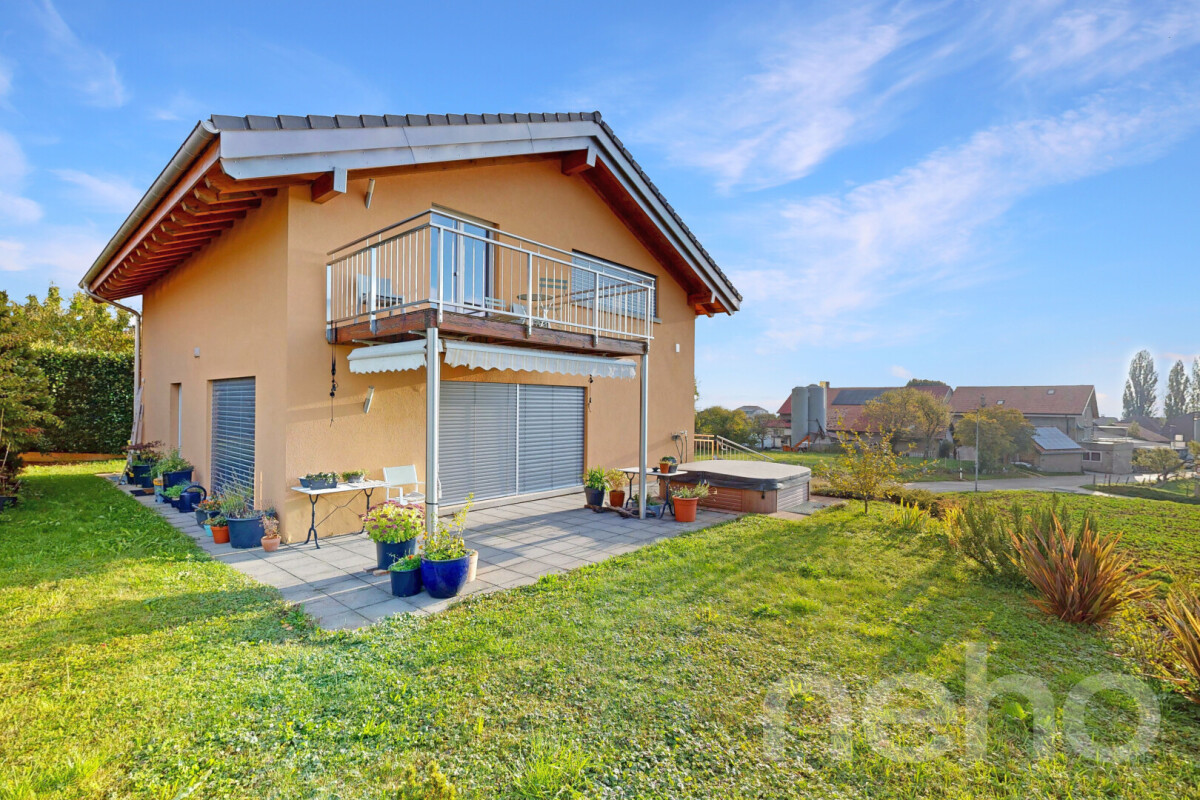 Découvrez cette maison lumineuse, conçue avec des matériaux de qualité et bénéficiant d'une belle exposition sud-ouest. Idéale pour les familles, elle offre un cadre de vie serein avec un jardin privé bien entretenu qui promet des moments de détente en plein air.La propriété, d'une surface habitable de 150 m² sur un terrain de 555 m², est dotée d'un jacuzzi pour vous offrir un confort ultime. Son garage indépendant assure une facilité d'accès et de stationnement.À l'intérieur, vous trouverez 5.5 pièces bien réparties sur deux niveaux, comprenant quatre chambres spacieuses et deux salles de bains modernes. L'absence de vis-à-vis garantit une vue dégagée et une intimité totale.Ne manquez pas l'opportunité de vivre dans cette demeure fonctionnelle et accueillante. Contactez-nous dès aujourd'hui pour organiser une visite et laissez-vous séduire par le charme unique de cette propriété exceptionnelle.