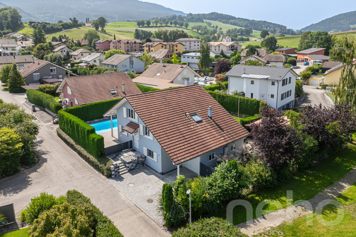 L'extérieur, exposé plein sud, dévoile un agréable jardin intime, agrémenté de vues dégagées sur la campagne. En complément, vous bénéficiez d'un garage, de plusieurs places de stationnement extérieures, et d'une connexion rapide à Fribourg grâce aux transports publics à proximité.