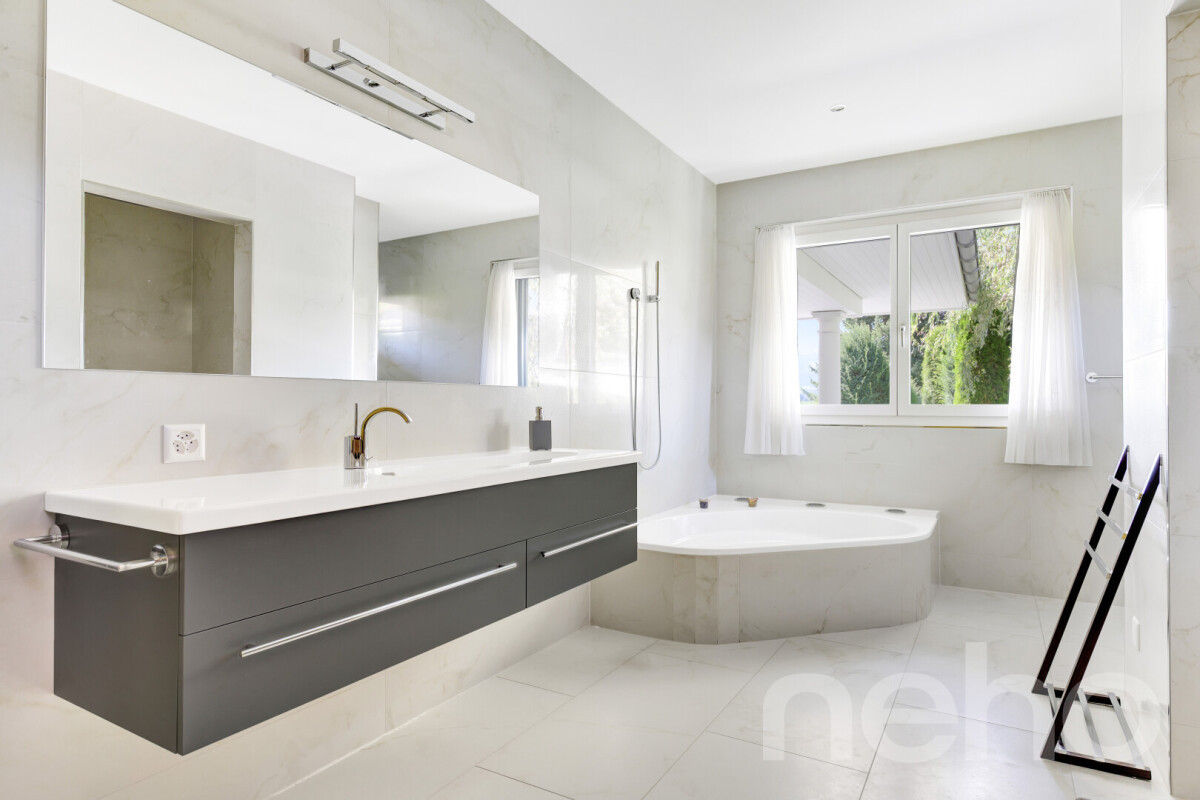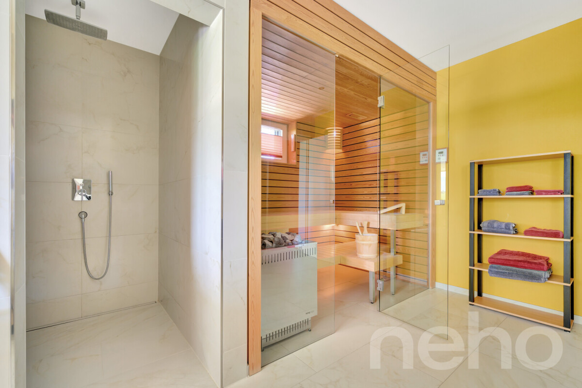 Drei luxuriös ausgestattete Bäder, darunter ein Bad mit integrierter Sauna, schaffen private Rückzugsorte und einen Ort zur Entspannung. Die Schlafzimmer sind lichtdurchflutet und grosszügig dimensioniert, teilweise mit direktem Zugang zum Badezimmer und bieten dadurch maximalen Komfort. Eine offene Galerie sowie ein weitläufiger Estrich auf der selben Etage bieten zusätzlichen Raum für Individualität und grosszügige Staumöglichkeiten.