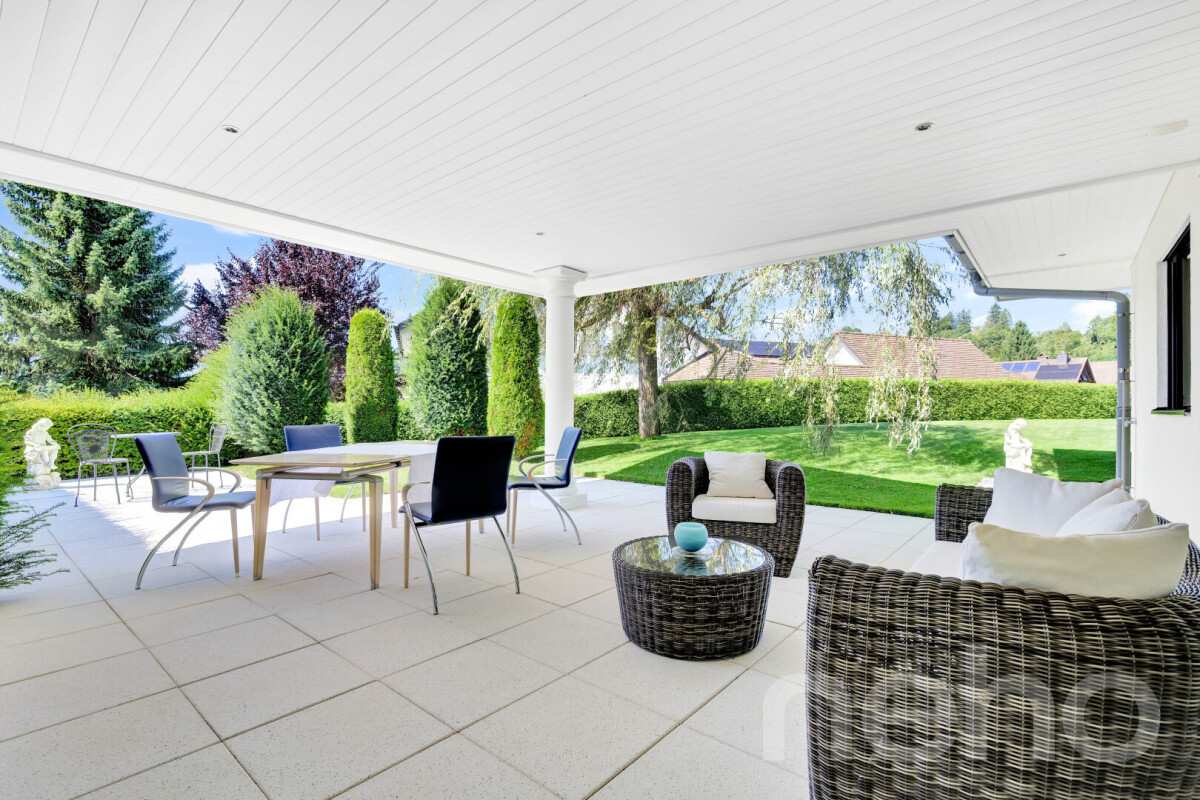 Das architektonische Konzept verbindet ein grosszügiges 6.5-Zimmer-Haupthaus mit einer eigenständigen 3.5-Zimmer-Einliegerwohnung, die über einen separaten Eingang und eine private Terrasse verfügt. Diese klare Trennung der Wohnbereiche eröffnet flexible Möglichkeiten - sei es für Mehrgenerationenwohnen, die stilvolle Unterbringung von Gästen oder ein repräsentatives Homeoffice.