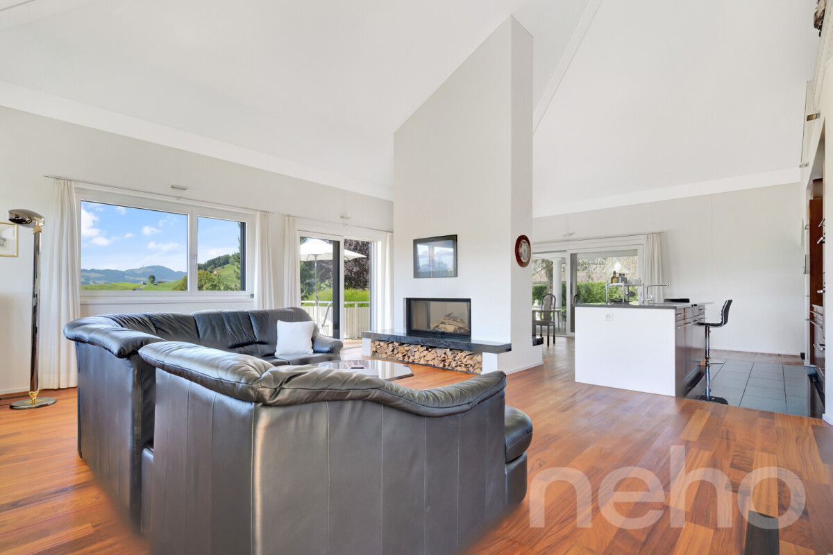Hochwertige Natursteinbeläge und schönes Doussieparkett verleihen den Räumen eine erhabene Atmosphäre, während grossflächige Fensterfronten mit dreifach verglasten Holz-Alu-Rahmen nicht nur für ein lichtdurchflutetes Raumgefühl sorgen, sondern zugleich Sicherheit und Energieeffizienz auf höchstem Niveau gewährleisten. Der Wohn- und Essbereich wird durch ein zentrales Cheminée geprägt, das Wärme, Behaglichkeit und architektonische Finesse harmonisch miteinander verbindet. Die angrenzende, offene Küche erfüllt mit modernsten Geräten höchste kulinarische Ansprüche und avanciert zum Treffpunkt für Genuss und Gastlichkeit.