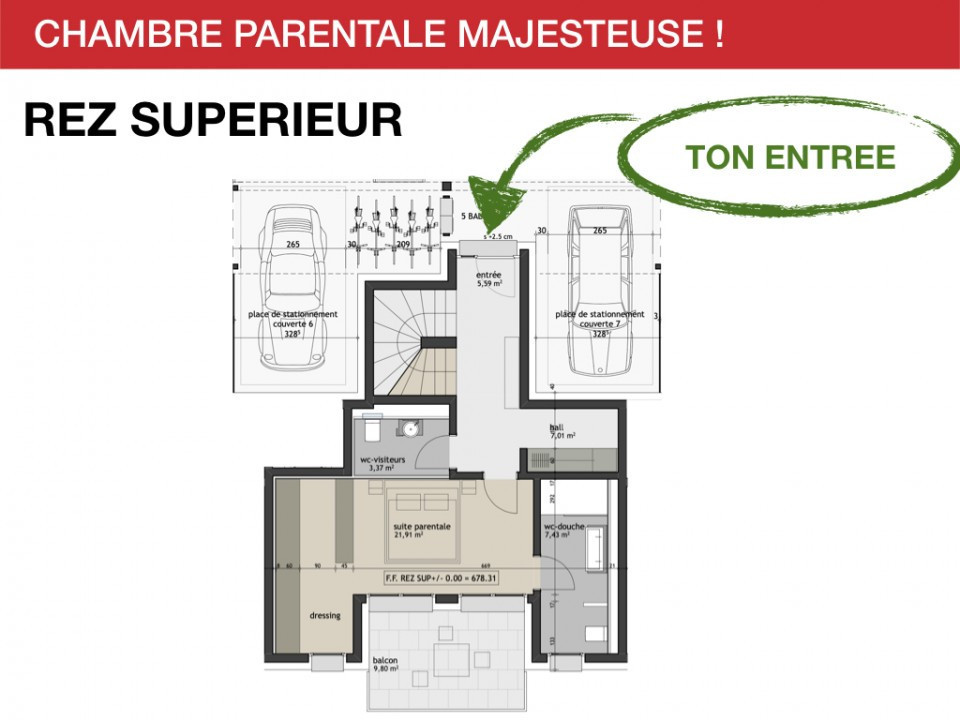 - rez sup.: hall d’entrée avec armoire, 1 WC visiteur, 1 chambre parentale avec dressing, salle d’eau (WC, baignoire/douche) et accès terrasse.