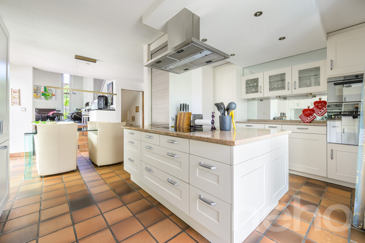Im Erdgeschoss liegen Küche und Essbereich mit direktem Zugang zum beheizten Wintergarten. Von hier führt ein Steg aus Natursteinplatten zum Naturpool mit Bachlauf. Das Wohnzimmer mit Cheminée, ein Gäste-WC, ein Schlafzimmer und die Doppelgarage vervollständigen das Geschoss.