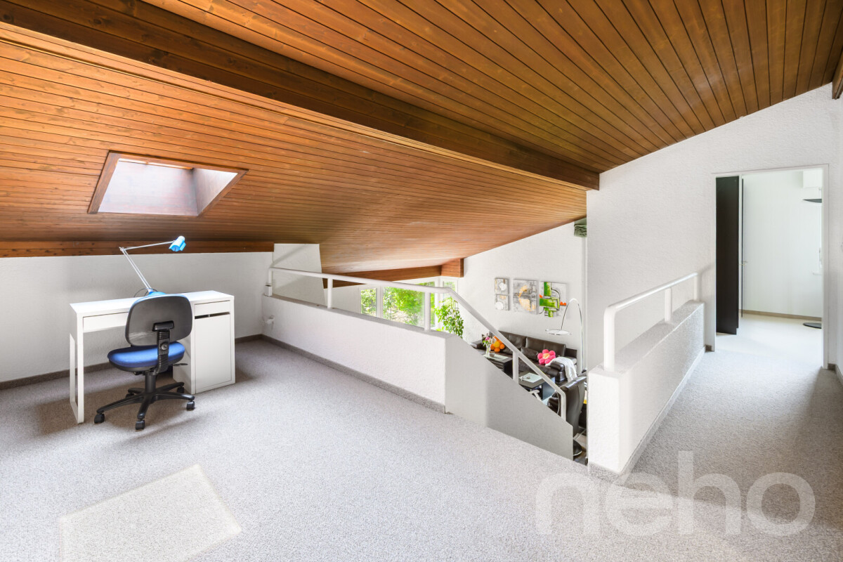 Im Obergeschoss befinden sich ein Schlafzimmer mit Ankleide und Ensuite-Dusche, ein weiteres Badezimmer mit Badewanne sowie ein grosszügiges Zimmer, das bei Bedarf in zwei Räume aufgeteilt werden kann.