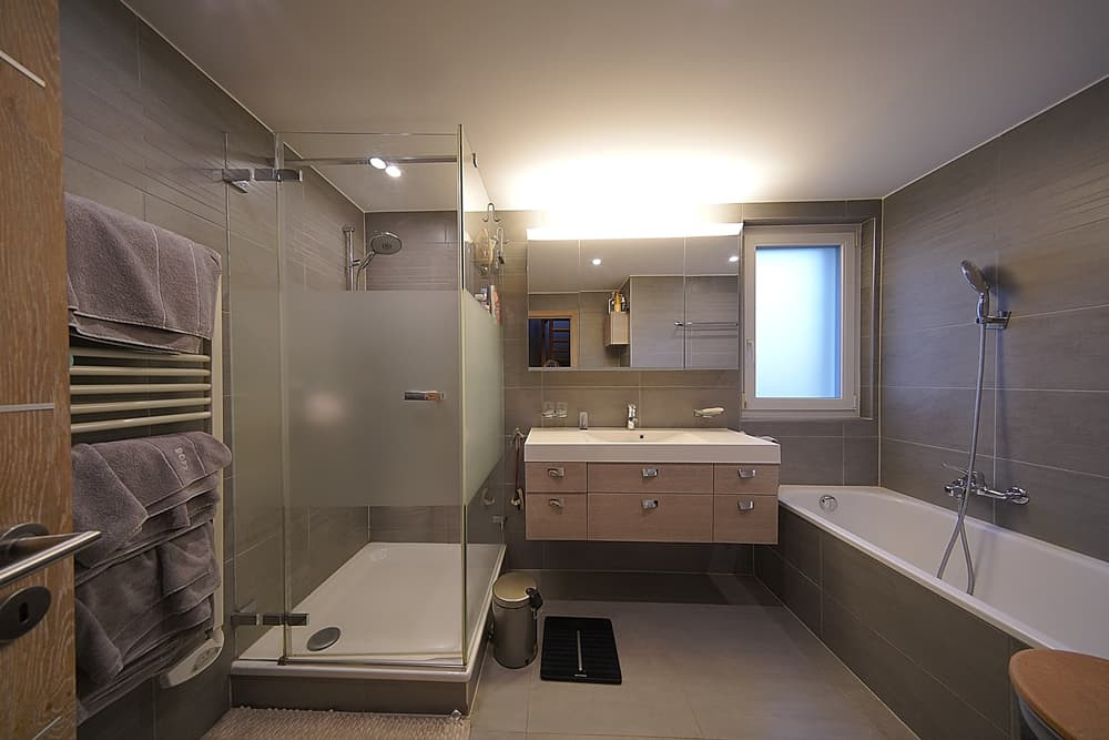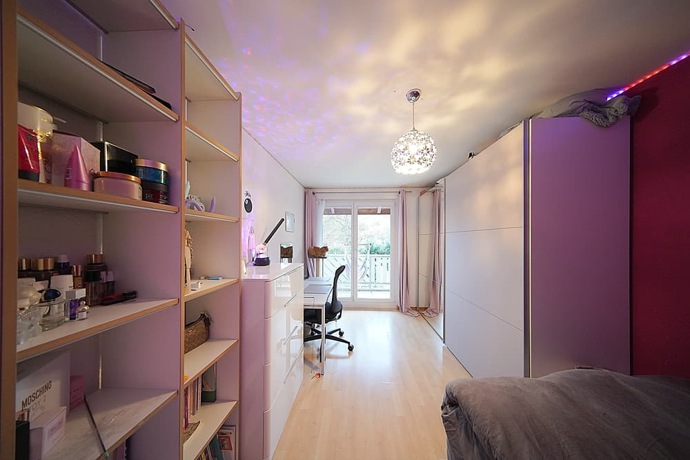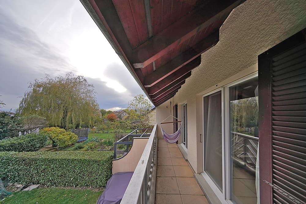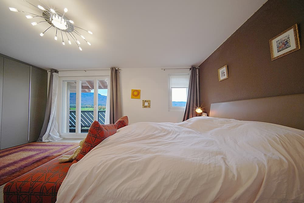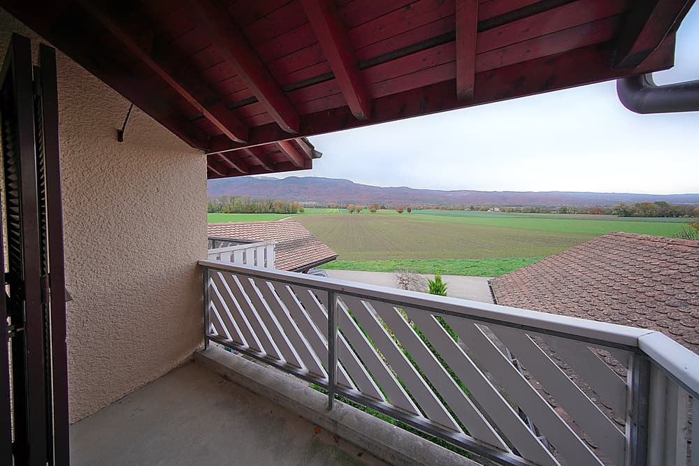 A l'étage : 3 belles chambres dont 2 donnant accès à un balcon au sud et 1 autre équipée d'un grand dressing aménagé, avec un balcon au nord et un grand dégagement sur les champs et le Jura, 1 salle de bains avec douche et baignoire.
