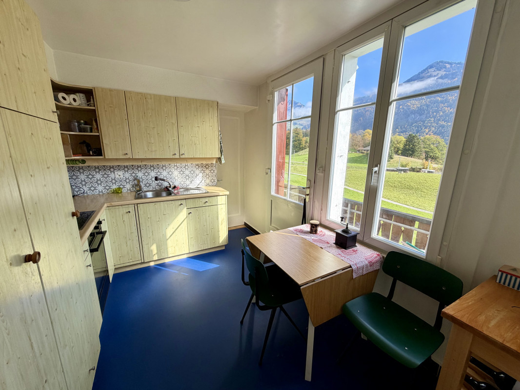 Cuisine / salle à manger avec accès direct au balcon offrant une vue imprenable sur les montagnes et la campagne