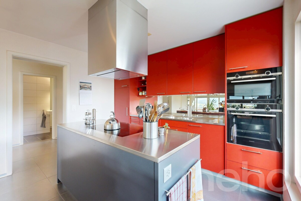 Auf rund 141 m² Wohnfläche verteilt über drei Etagen bietet das Haus grosszügige, lichtdurchflutete Räume und eine hochwertige Ausstattung. Der offene Wohn- und Essbereich mit Cheminée bildet das Herzstück des Hauses. Die moderne Küche fügt sich harmonisch in den Wohnraum ein und bietet viel Stauraum.