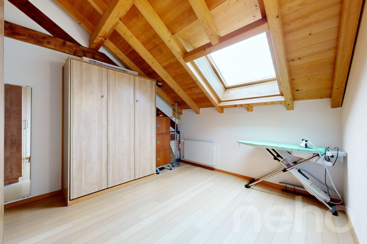 Découvrez une maison mitoyenne parfaite pour une famille à la recherche d'un cadre de vie paisible et agréable. Située dans un emplacement tranquille avec une exposition idéale au sud-ouest, cette propriété offre une vue dégagée et sans vis-à-vis, promettant ainsi des moments de détente inégalés.Rénovée en 2015, cette demeure se compose d'un appartement en duplex de 3.5 pièces avec deux chambres en attique et d'un deux pièces au rez-de-chaussée.