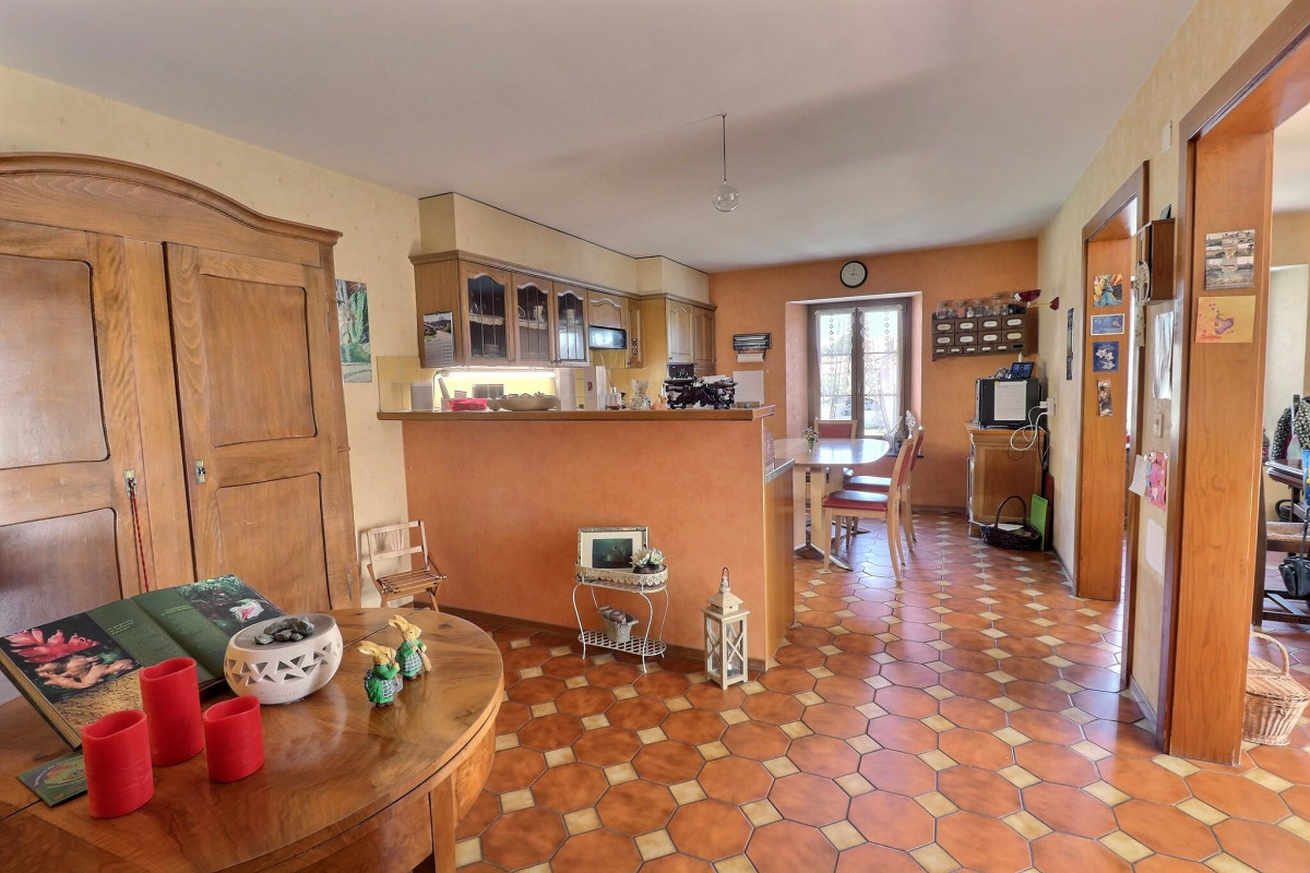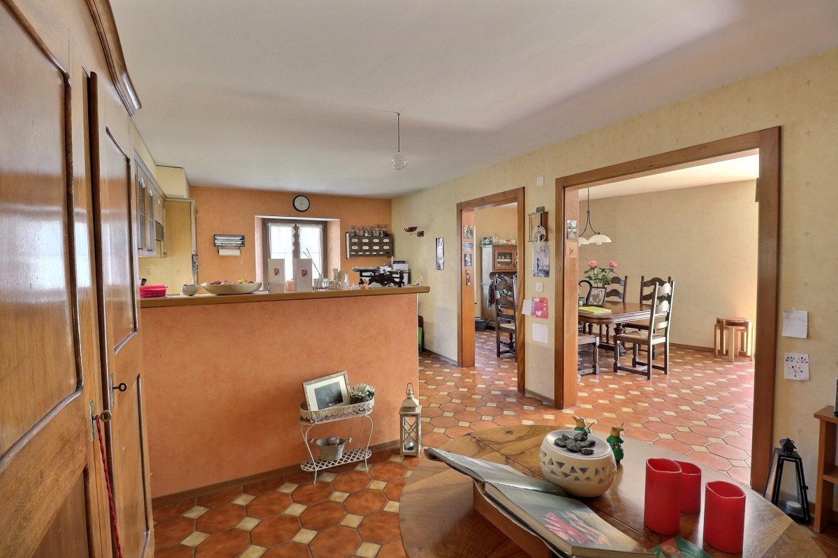 Accessible par un escalier extérieur et intérieur, le premier étage constitue le coeur de vie de la maison. On y découvre une cuisine ouverte sur une salle à manger conviviale et un salon chaleureux agrémenté d'une cheminée, créant une atmosphère accueillante en toute saison. Une chambre avec sa salle de douche et ses toilettes, ainsi qu'un réduit, viennent compléter cet étage.