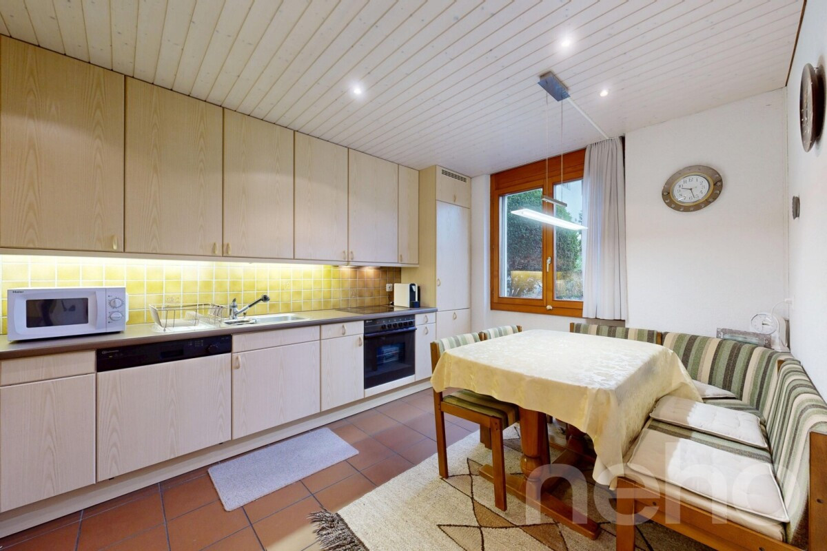 Das Erdgeschoss bildet den zentralen Wohnbereich mit Küche, Wohn- und Essbereich sowie einem Gäste-WC. Die grosszügige Terrasse mit über 30 m² erweitert den Wohnraum nach draussen und bietet viel Platz für entspannte Stunden oder gesellige Abende.