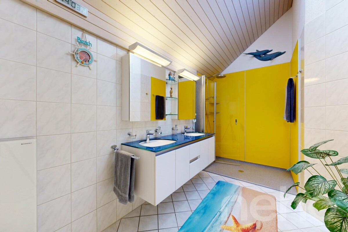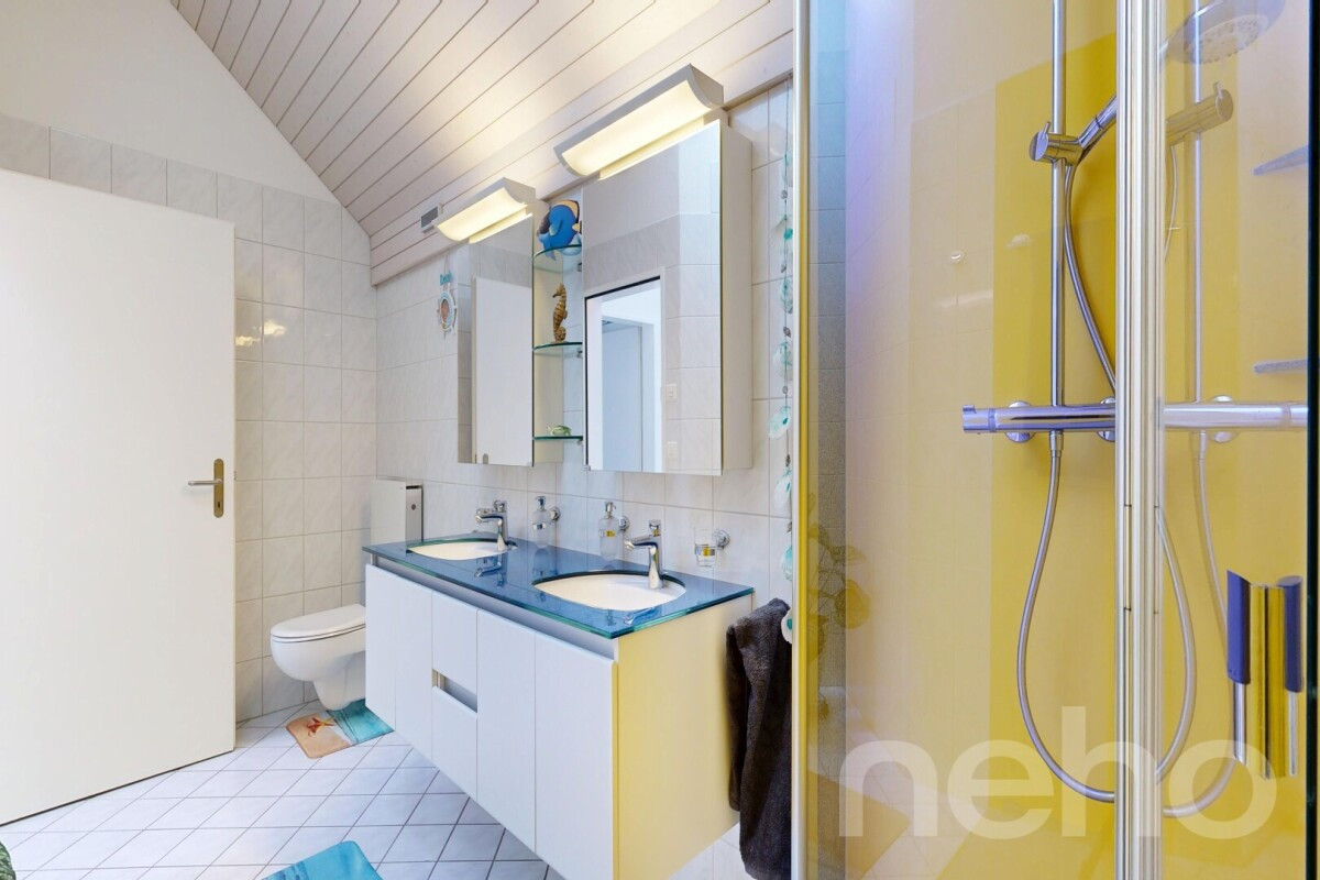 Die moderne und funktionale Küche überzeugt mit viel Stauraum und einer praktischen Aufteilung. Insgesamt stehen drei helle Schlafzimmer mit hohen Decken zur Verfügung, wobei das Hauptschlafzimmer zusätzlich über einen praktischen Ankleideraum verfügt. Das helle Badezimmer ist mit einer grosszügigen Dusche sowie einem Doppellavabo ausgestattet?.? Ergänzt im Erdgeschoss durch ein separates WC und ein grosszügiges Büro, das mit einer Dampfdusche und Sauna ausgestattet ist und vielseitig genutzt werden kann.
