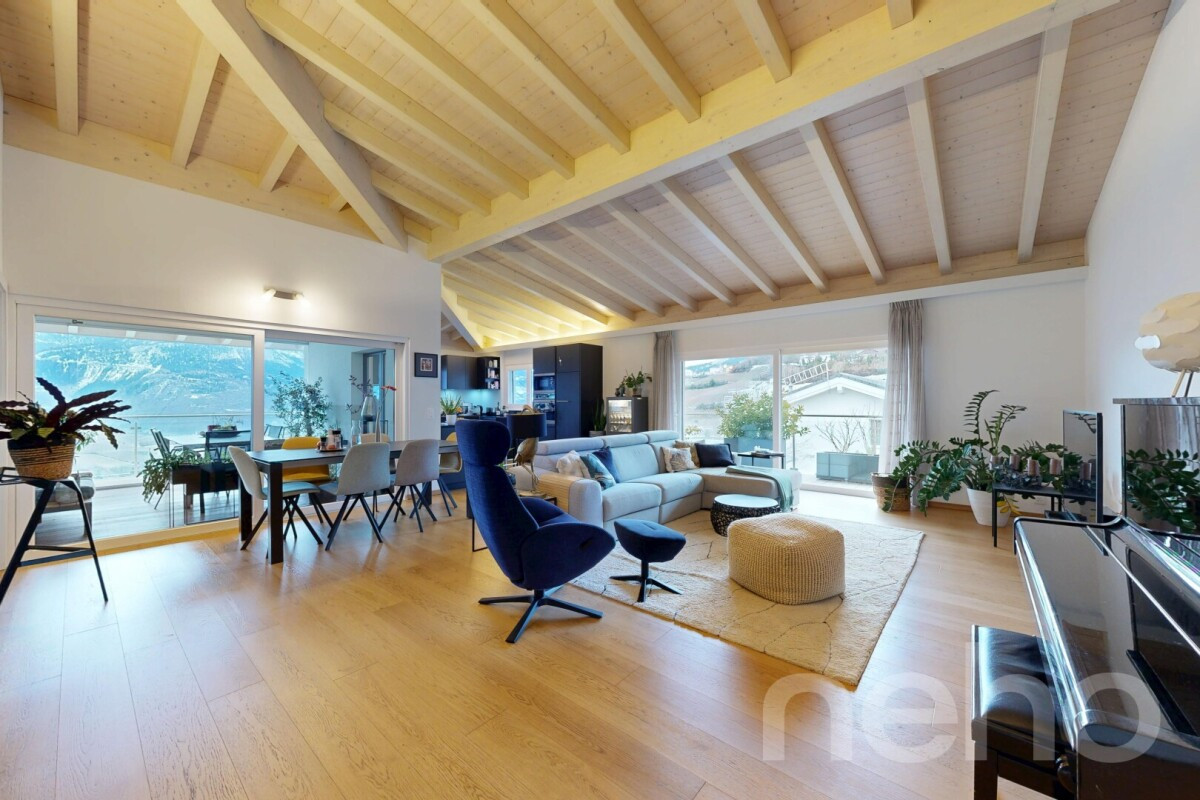 With a volume of 1,550 m³ and over 260 m² of living space, this magnificent high-standing property located in Miège comprises a 7-room main residence and an independent 4½-room apartment, offering generous volumes, abundant natural light and high-quality finishes. Flooded with daylight thanks to large bay windows, the house features comfortable, well-designed living areas and a warm, contemporary atmosphere, with both the main residence and the separate apartment benefiting from modern layouts and direct access to a terrace or balcony to fully enjoy the sunshine and surrounding views. The independent apartment represents a significant added value and can be used for rental income, professional activity, accommodation for a relative or a private guest suite. The property also offers several indoor and outdoor parking spaces, a rare advantage in this highly sought-after residential area. Ideally located on Route de Clos Louis 15 in a quiet and sunny neighborhood of Miège, it enjoys a pleasant living environment while remaining close to amenities, schools, public transport and with quick access to the centers of Sierre and Crans-Montana, making it an ideal opportunity for those seeking a spacious, versatile and high-quality home in the heart of Valais.