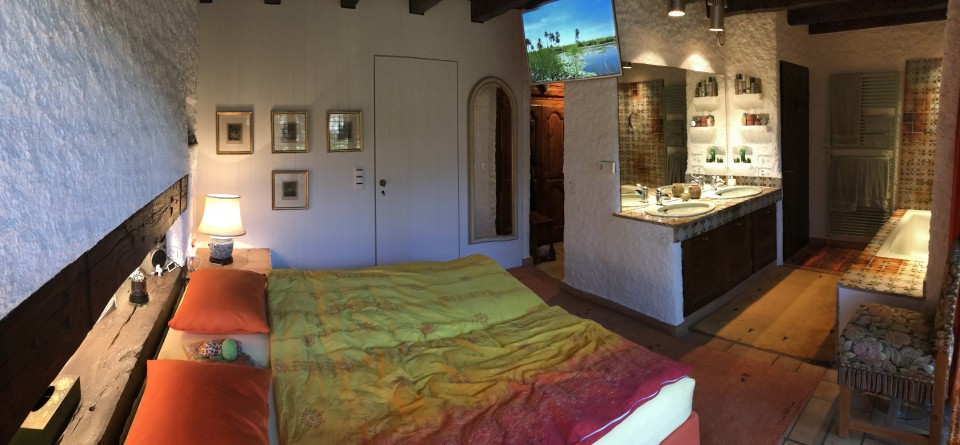Une magnifique et large piscine (avec hublot) avec couverture automatique et escalier, entourée d’une généreuse plage et terrasse bain de soleil carrelée, surplombée d'un jacuzzi avec 6 plaques à bulles et 6 buses de massage réglables (= 12 personnes). Les deux bassins sont chauffés par pompe à chaleur à 28°, resp. 35°. Celle-ci chauffe également le Pavillon de piscine .