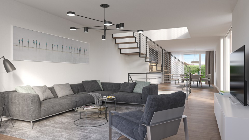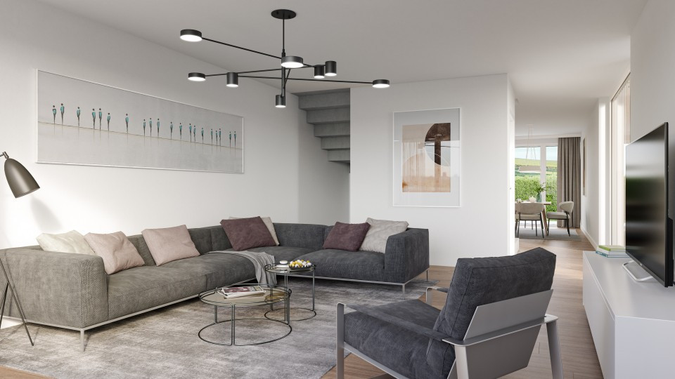 Chaque Villa Contiguë dispose d'une surface utile entre 184 m2 et 187 m2 répartie sur 4 niveaux (y compris les sur combles). Au rez-de-chaussée supérieur est prévu l’espace vie avec une zone séjour ainsi qu’une cuisine ouverte à côté d’une grande baie vitrée donnant sur la terrasse.