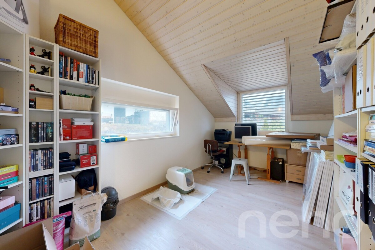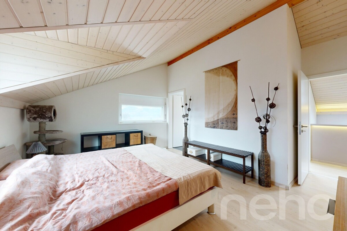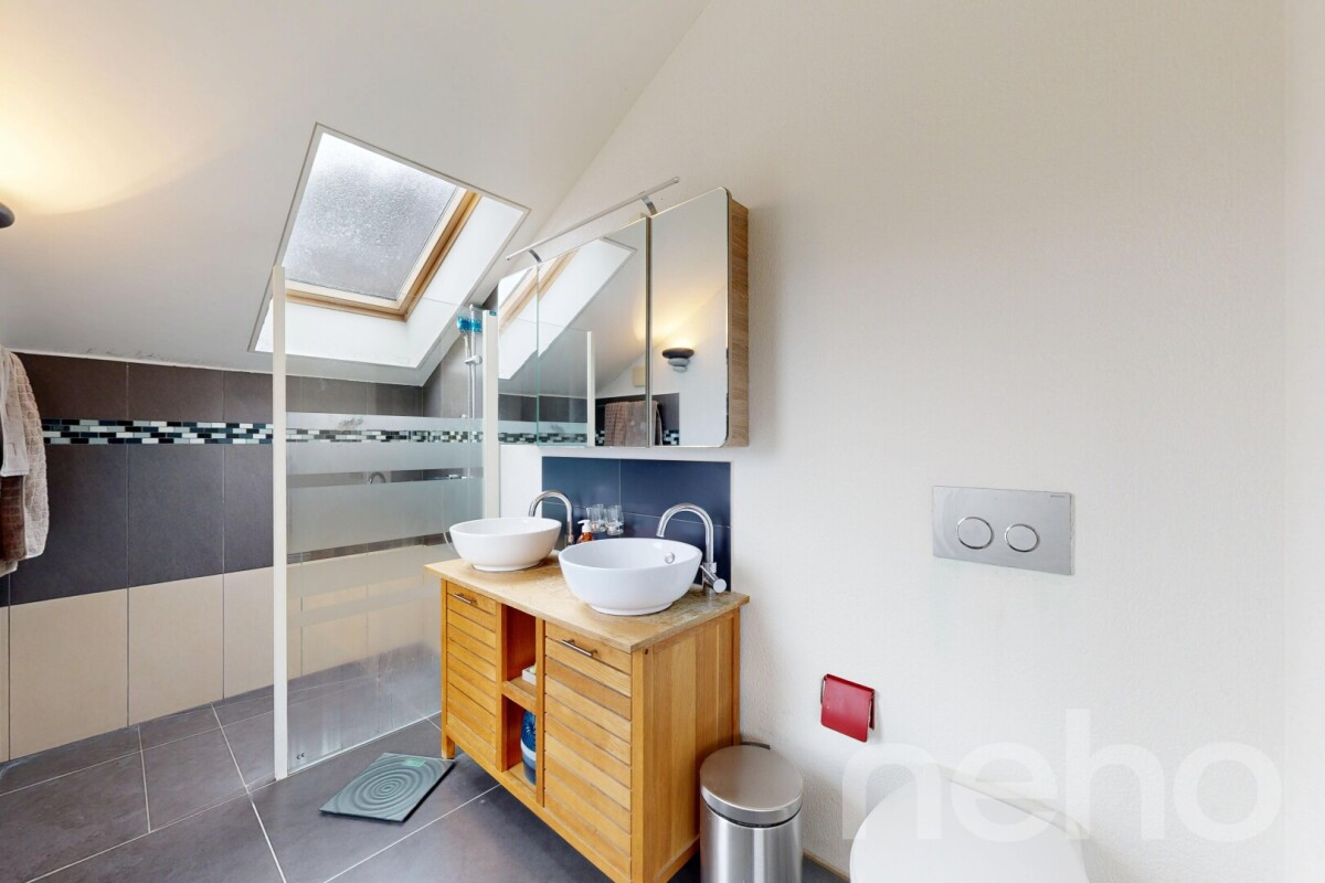 Dans les étages un duplex de 4.5 pièces avec un grand espace de jour, 3 chambres, 2 salles d'eau et un WC visiteur possède un balcon et une grande terrasse de 50 m2 donnant sur un panorama dégagé.