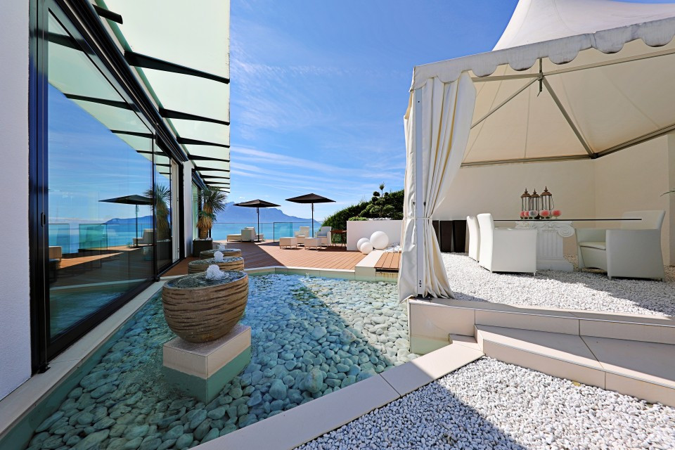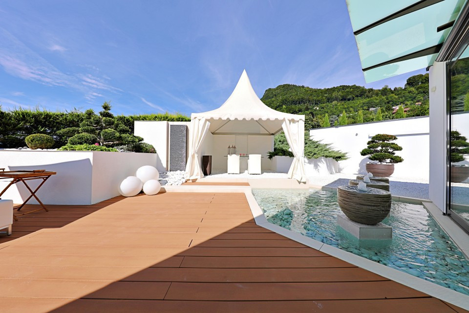 Depuis la pièce à vivre on accède aussi à une première terrasse paradisiaque sur laquelle on peut dîner et recevoir dans une ambiance festive. Sur le même étage se trouve également une chambre d’amis avec sa salle de bain attenante.
