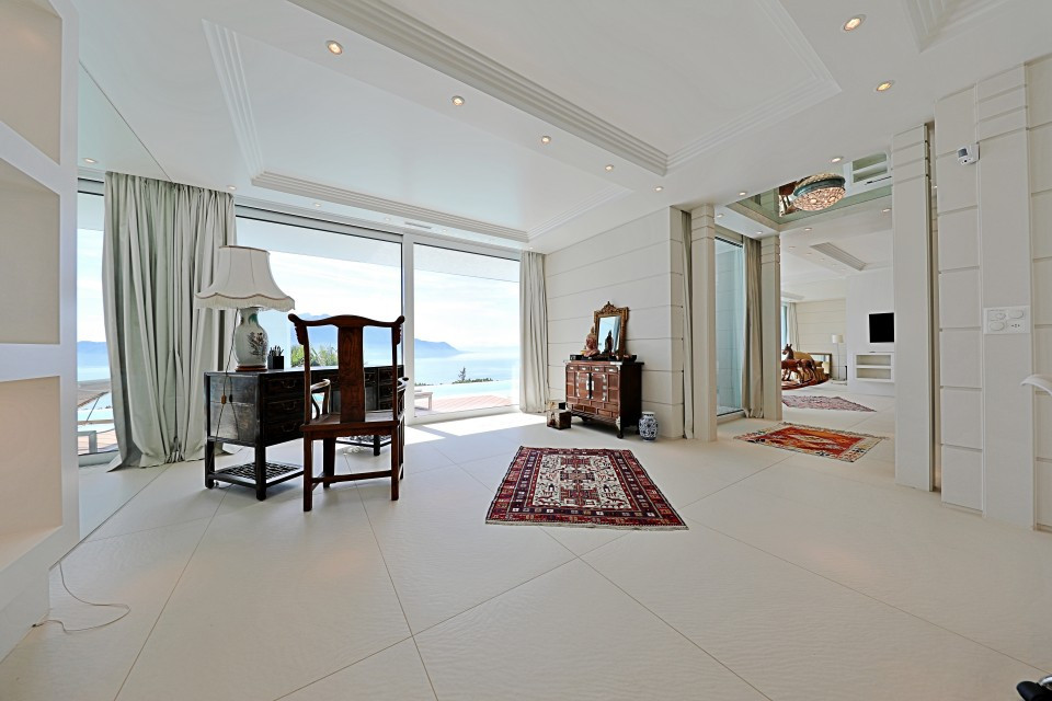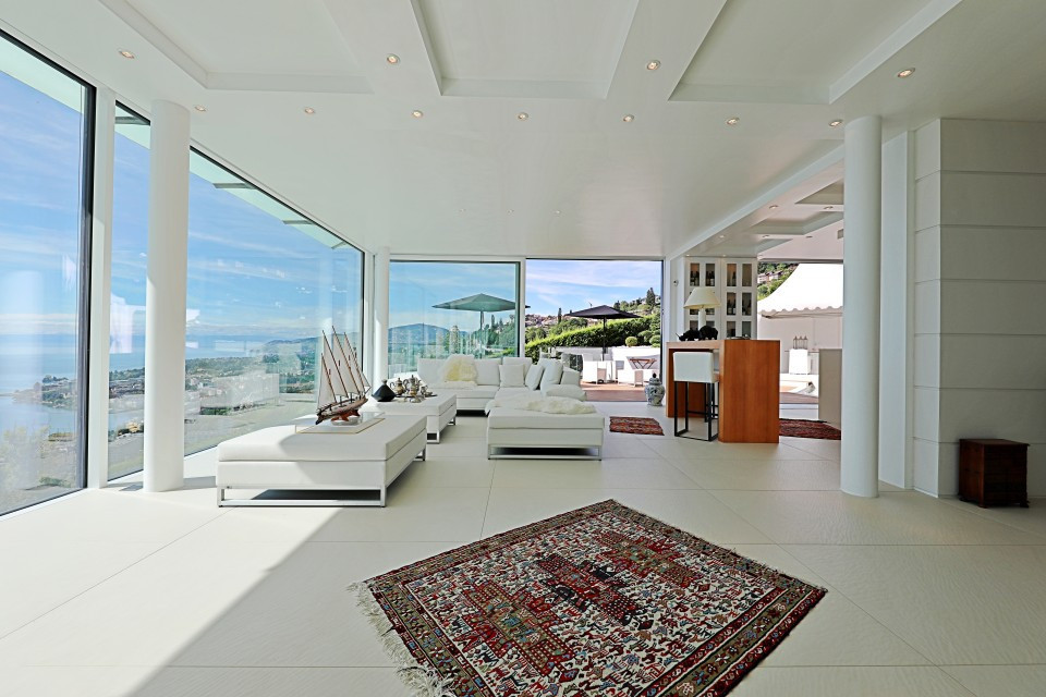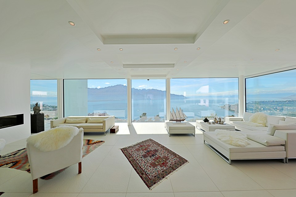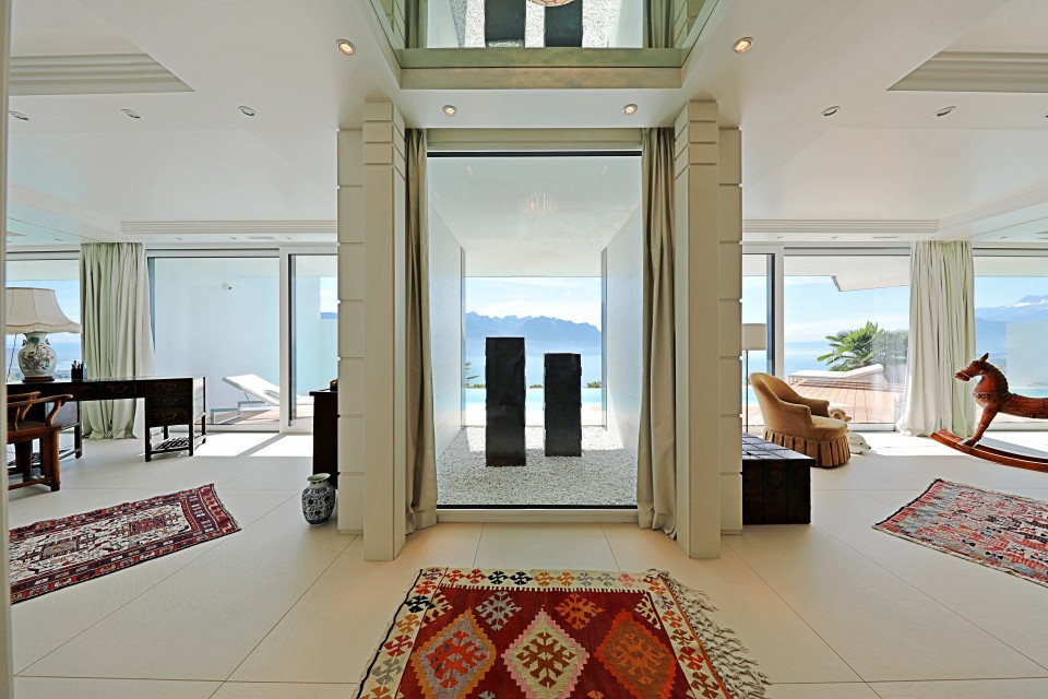 Une fois franchie la porte sécurisée de la propriété, un patio en gravillons vous emmène immédiatement dans un monde à part. A l’intérieur de la maison on découvre un magnifique hall d’entrée qui donne un avant goût de la vue époustouflante qui envahit le vaste séjour. En effet la pièce à vivre bénéficie d’une hauteur de plafond exceptionnelle et est subdivisée en un espace salon et un espace cheminée. Toute la pièce est baignée de lumière grâce aux immenses baies vitrées qui amplifient l'impression de dominer tout le lac.