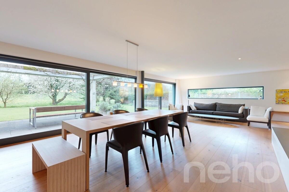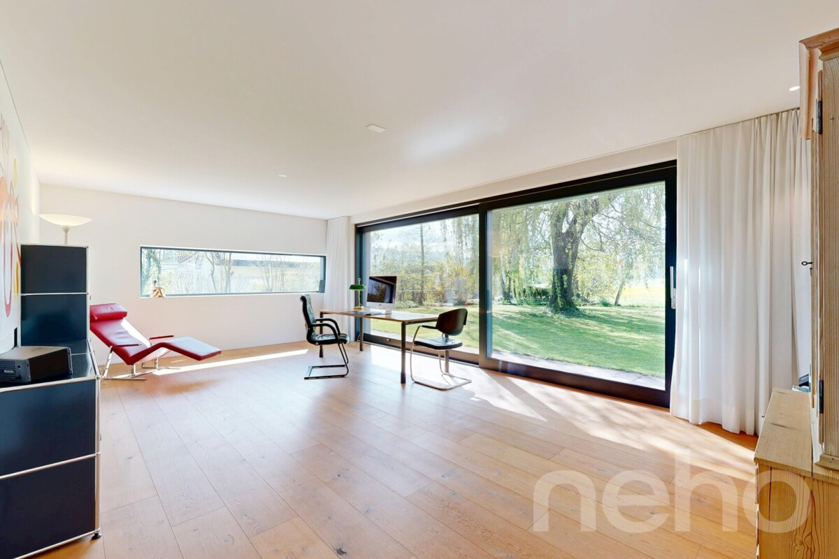An ruhiger, diskreter Wohnlage in Mörschwil überzeugt diese aussergewöhnliche Liegenschaft durch ihre Grosszügigkeit, hohe Privatsphäre und die unmittelbare Nähe zur umgebenden Natur. Eingebettet in ein weitläufiges Grundstück von 1'448 m² entsteht ein Wohnumfeld, das Offenheit, Ruhe und architektonische Klarheit auf harmonische Weise vereint.Das im Jahr 2011 erstellte Einfamilienhaus präsentiert sich in einem sehr gepflegten Zustand und bietet mit rund 9.5 Zimmern sowie einer Wohnfläche von rund 337 m² ein beeindruckendes Raumangebot. Die Architektur ist geprägt von klaren Linien, grosszügigen Fensterflächen und einer durchdachten Ausrichtung zum Garten. Der über 60 m² grosse Wohn- und Essbereich bildet das Herzstück des Hauses und verbindet sich über raumhohe Verglasungen nahtlos mit der gedeckten Terrasse und dem Aussenraum. Die moderne Küche fügt sich elegant in das Gesamtbild ein, während das Cheminée eine warme und stilvolle Atmosphäre schafft.Die Raumstruktur eröffnet vielseitige Nutzungsmöglichkeiten: Mehrere grosszügige Schlafzimmer, ein separates Büro mit über 30 m² sowie zusätzliche Zimmer bieten ideale Voraussetzungen für Familien, Homeoffice oder individuelle Lebenskonzepte. Im Obergeschoss ergänzen eine Ankleide, hochwertige Nassbereiche sowie ein privater Saunabereich das Wohnangebot und schaffen Rückzugsorte mit besonderem Komfort. Dank der klaren Aufteilung lässt sich die Liegenschaft bei Bedarf auch als Zweifamilienhaus nutzen.Im Untergeschoss stehen grosszügige Nebenflächen, Technik- und Lagerräume sowie eine Waschküche zur Verfügung. Die Beheizung erfolgt über eine Erdsonde und unterstreicht den zeitgemässen technischen Standard. Eine Doppelgarage sowie ein Carport runden das Angebot ab.Die Lage verbindet naturnahes Wohnen mit einer guten Erreichbarkeit der Stadt St. Gallen. Einkaufsmöglichkeiten, Schulen und der öffentliche Verkehr sind in kurzer Distanz erreichbar und bieten ein attraktives Umfeld für den Alltag.Richtpreis für diese Liegenschaft beträgt CHF 3'180'000.Gerne zeigen wir Ihnen diese besondere Liegenschaft bei einer persönlichen Besichtigung und freuen uns auf Ihre Anfrage.