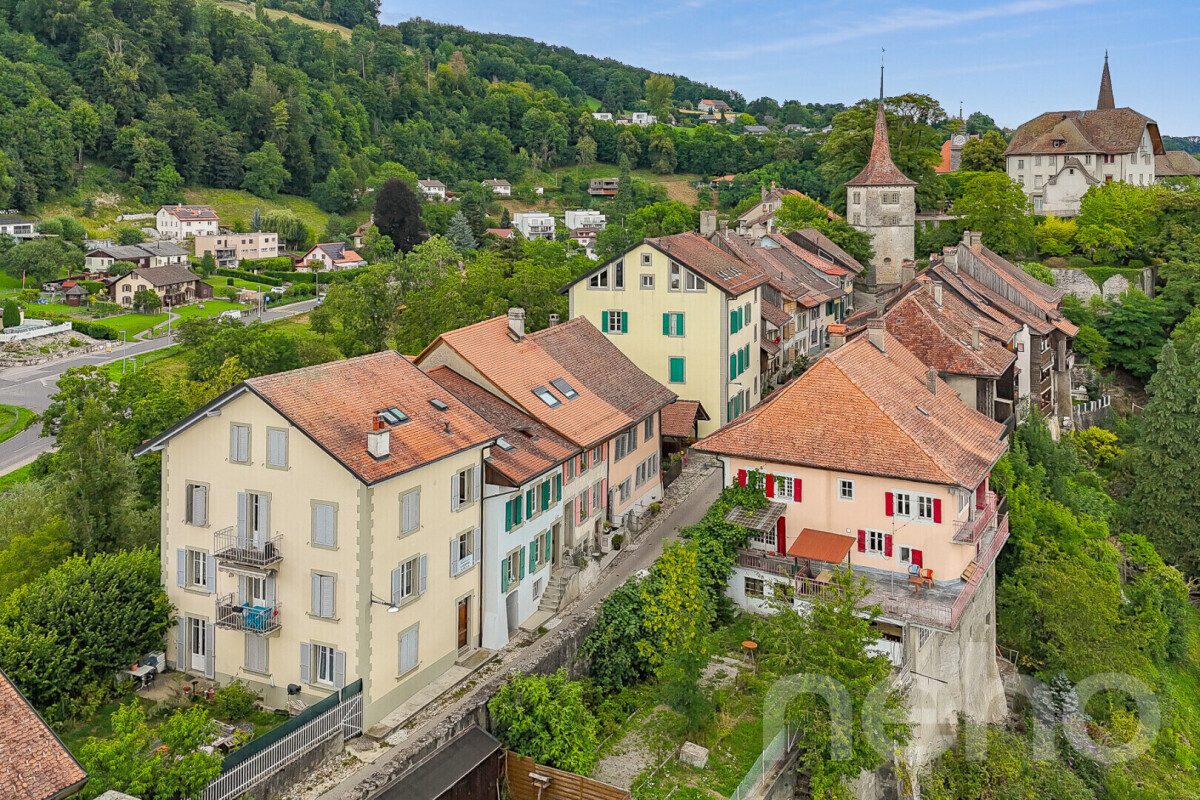 Niché au sein du bourg médiéval de Moudon, classé d'intérêt national, cet immeuble traversant datant de 1800 incarne l'alliance rare entre patrimoine architectural et qualité de vie. La Rue du Bourg, perchée sur une crête rocheuse, offre un décor pittoresque où chaque façade en molasse, chaque détail gothique, raconte l'histoire d'un quartier vivant et authentique.