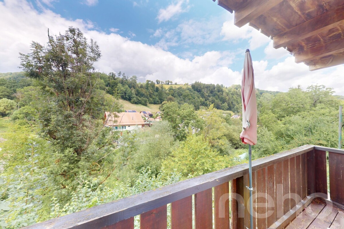 Easily accessible via a large public car park below, the property enjoys an exceptional setting: to the north, a stream (La Mérine) lined with mature trees; to the south, an open view of the Broye valley. Its north-south layout guarantees generous natural light and refreshing cross-ventilation, especially appreciated in summer.