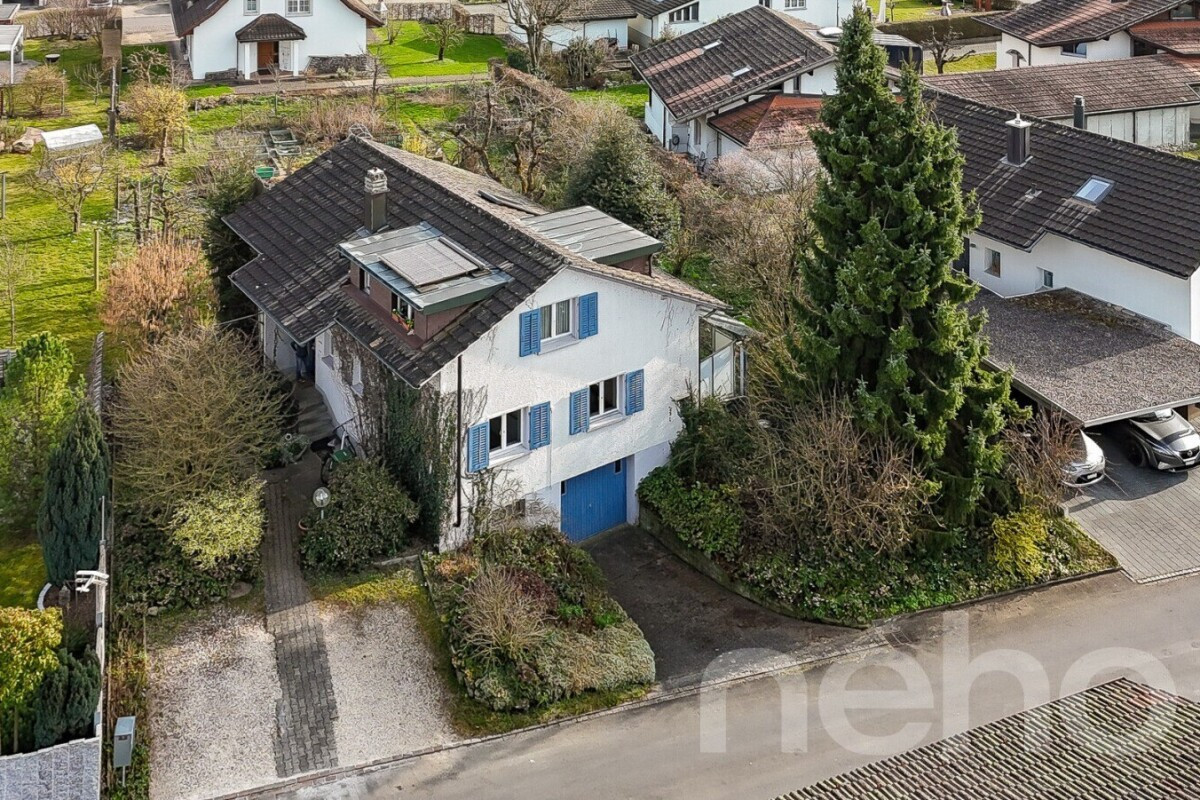 Zum Verkauf steht ein charmantes 7.5-Zimmerhaus aus dem Jahr 1956, eingebettet auf einem grosszügigen Grundstück von 1013?m2 reinem Bauland. Die Immobilie bietet rund 128?m2 Nettowohnfläche auf zwei Ebenen und überzeugt durch viel Gestaltungspotenzial. Im Erdgeschoss befindet sich eine helle 4-Zimmerwohnung mit separater Küche, Badezimmer und einer ca. 20?m2 grossen Terrasse - ideal für entspannte Stunden im Freien. Über ein eigenes Treppenhaus gelangt man in die 3.5-Zimmerwohnung im Obergeschoss, die mit gemütlicher Dachschräge, Dachfenstern, Küche, Bad und einem ca. 16?m2 grossen Balkon eine einladende Wohnatmosphäre schafft. Die Liegenschaft eignet sich perfekt für Familien, Paare mit hohem Platzbedarf oder als Anlageobjekt für Investoren, die Wert auf Ausbau- und Entwicklungsmöglichkeiten legen. Eine Garage und zwei Aussenabstellplätze sind inklusive, während die auf dem Dach installierte Solaranlage die Warmwasseraufbereitung unterstützt. Das Haus vereint Ruhe, Raum und vielseitige Nutzungsmöglichkeiten - ein ideales Zuhause oder renditestarke Investition in begehrter Lage.Haben wir Ihr Interesse geweckt? Nehmen Sie mit uns Kontakt auf - wir freuen uns, von Ihnen zu hören.