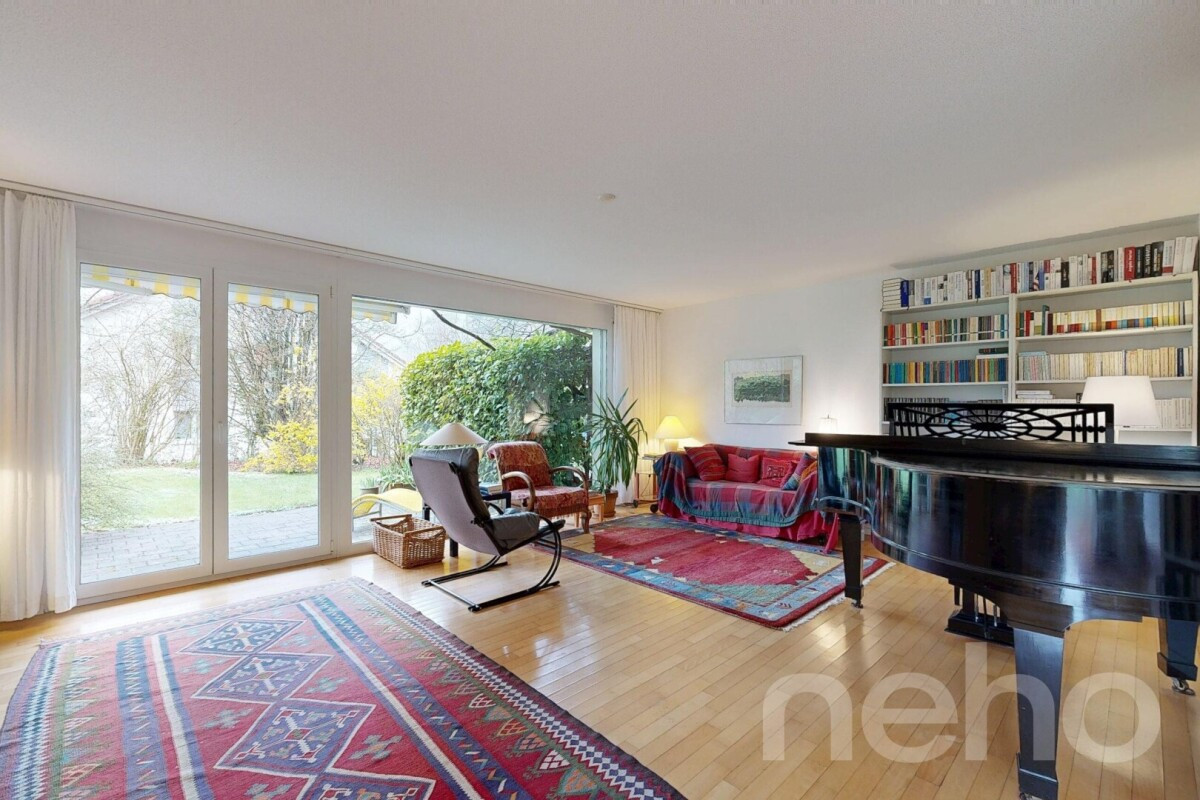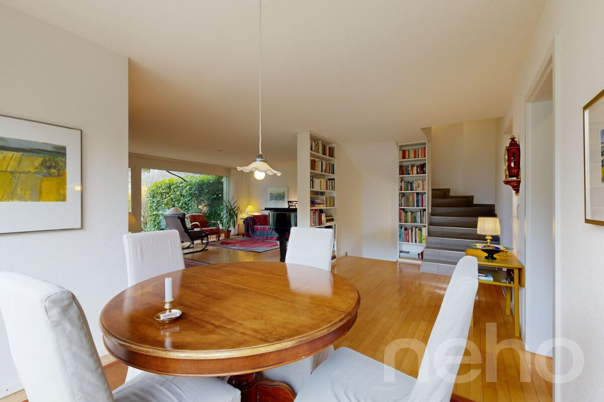 Der Wohn- und Essbereich im Erdgeschoss bildet das Herzstück des Hauses. Grosse Fensterflächen sorgen für viel Tageslicht und schaffen eine angenehme Wohnatmosphäre. Von hier aus gelangen Sie direkt zu den verschiedenen Sitzplätzen im Garten, die zum Verweilen und Geniessen einladen. Ergänzt wird diese Etage durch eine Küche, ein Entree mit Garderobe sowie ein Gäste-WC.